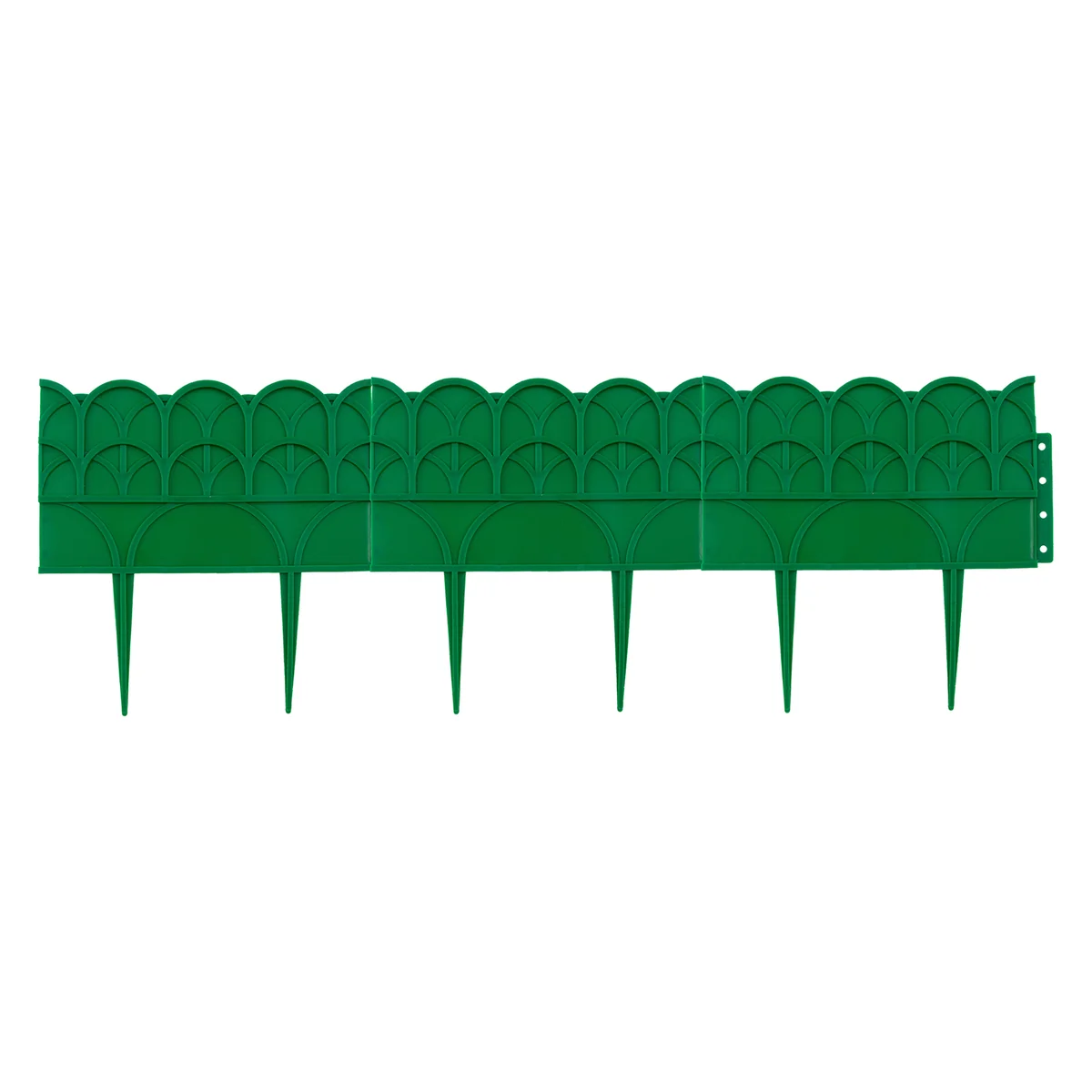 Зеленый бордюр «Прованс» 65065, 14 х 310 см используется для оформления озелененных территорий. Его составная конструкция позволяет огородить участок любой формы — клумбу, водоем, приствольный круг дерева, садовую дорожку.Преимущества Бордюр выполнен из высококачественного пластика, поэтому он прочен, долговечен, устойчив к перепадам температур, ультрафиолету и осадкам. Простая установка — достаточно скрепить секции между собой и погрузить их ножки в грунт. Бордюром можно оградить участок любой формы — прямоугольной, круглой, овальной, треугольной. Зеленый цвет гармонирует с окружающим ландшафтом, придавая ему завершенный вид.