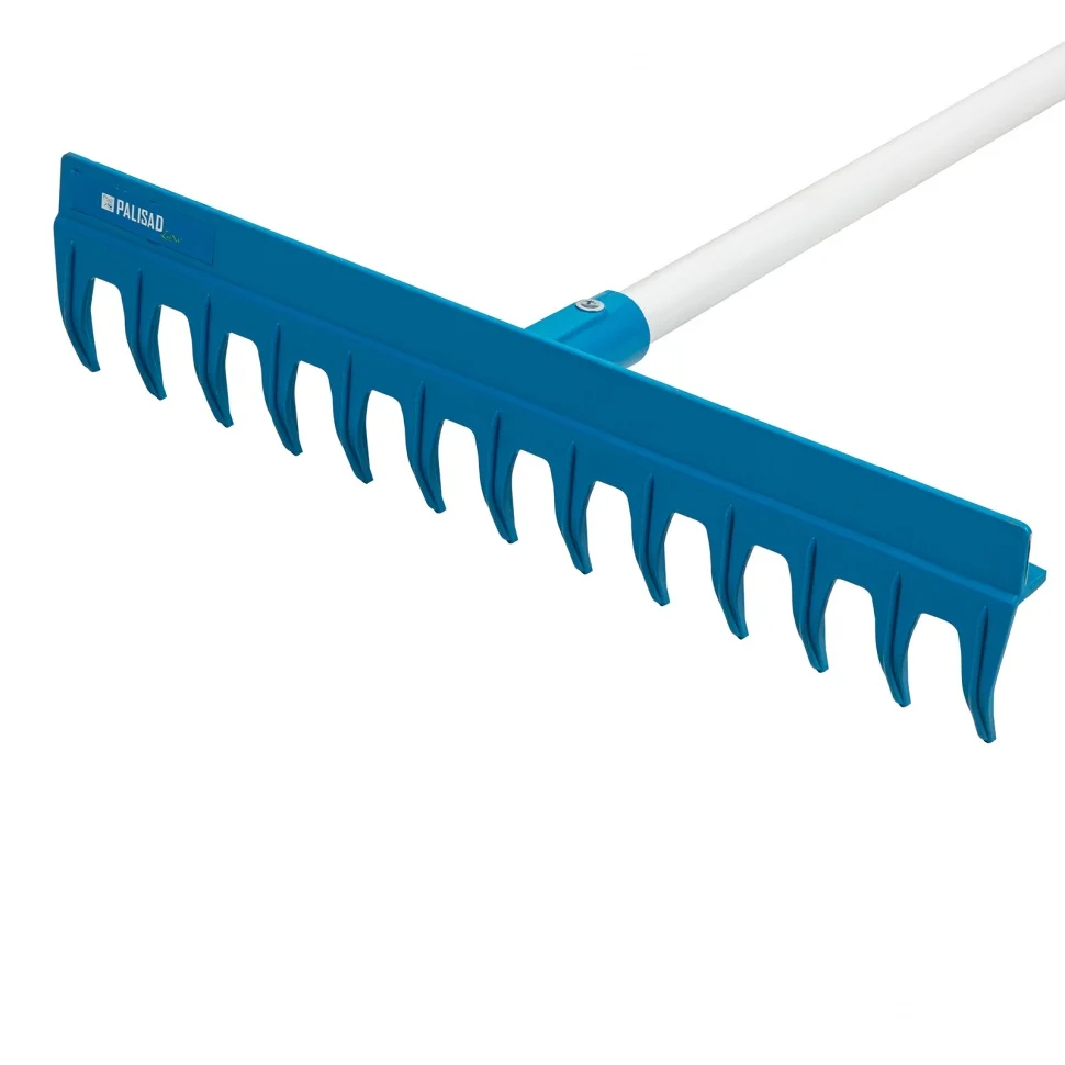 Усиленные пластиковые грабли Palisad LUXE 61739 с 13 прямыми зубьями и шириной рабочей части 430 мм, с металлическим черенком, - садовый инвентарь, предназначенный для рыхления почвы, а также уборки территории. Грабли поставляются в сборе с черенком.ПреимуществаГрабли изготовлены из высококачественного полипропилена, устойчивого к перепадам температур и ультрафиолету, поэтому прослужат долго.Благодаря утолщеннному профилю зубьев и ребрам жесткости грабли выдерживают большие нагрузки и не ломаются.Грабли легко проникают в грунт благодаря заостренным концам зубьев.За счет облегченного черенка из алюминиевого сплава с граблями удобно работать долгое время без усталости.