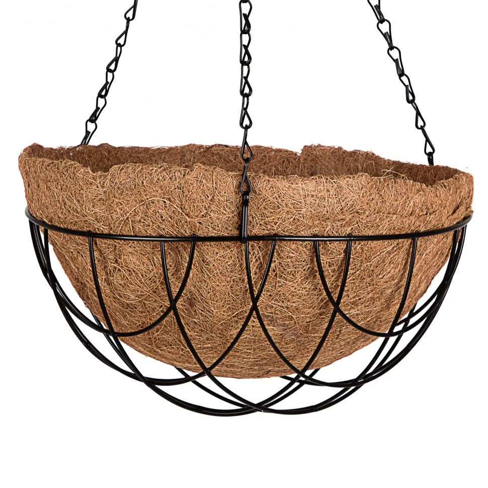 Кашпо подвесное полукруглое с вкладышем из коковиты Palisad 69017, диаметр 30 см, используется для посадки ампельных и вьющихся растений. Оно станет прекрасным украшением дома или сада. Кашпо подходит для подвешивания как внутри, так и снаружи помещения.ПреимуществаСтальной каркас и цепочки покрыты краской, это обеспечивает защиту от коррозии.Горшок не нужно покупать отдельно, растения можно размещать в самом вкладыше.Экологический чистая коковита отлично удерживает влагу и обеспечивает аэрацию корневой системы, это способствует правильному росту растений.Кашпо оснащено крючком для удобства подвешивания.