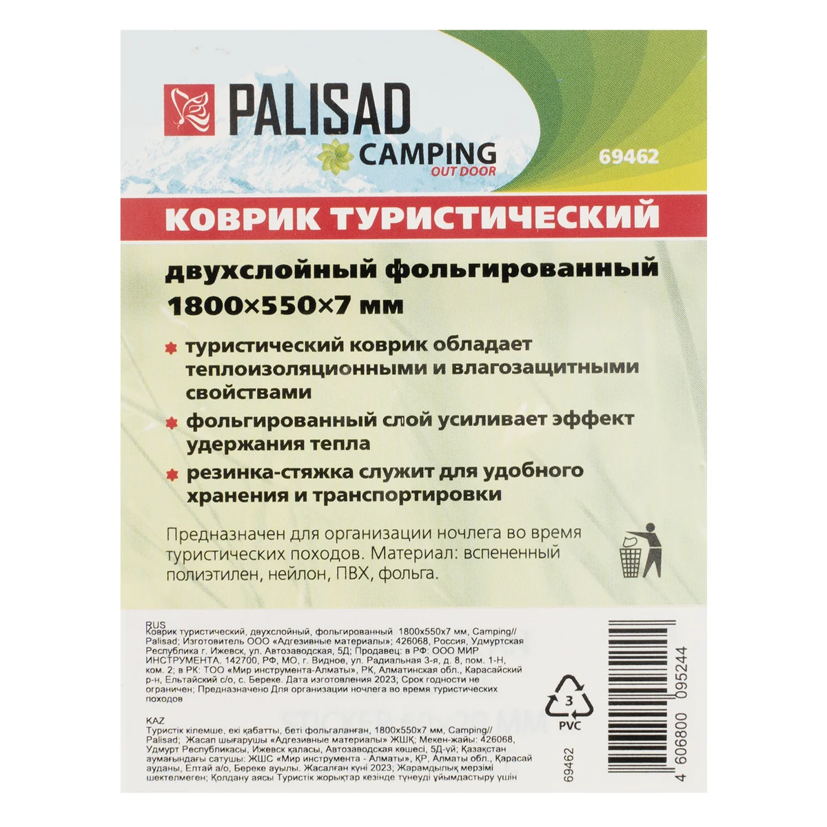 Двухслойный туристический коврик Palisad Camping 69462 размером 1800 х 550 х 7 мм, с фольгированным слоем, позволяет организовать комфортный отдых даже на сырой холодной земле. Не пропускает влагу, а фольгированный слой способствует эффективному сохранению тепла. Коврик незаменим во время туристического похода.ПреимуществаЗа счет малого веса 180 г удобен для транспортировки.Легко моется и быстро сохнет.Удобно сворачивается в компактный рулон и закрепляется резинкой-стяжкой.