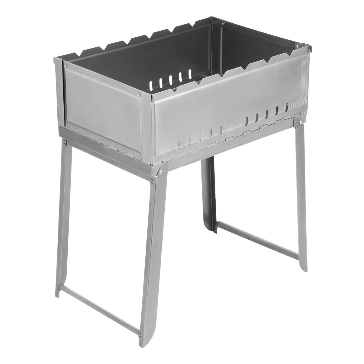 - Долгий срок службы — мангал изготовлен из жаропрочной углеродистой стали увеличенной толщины 1 мм, ребра жесткости повышают прочность конструкции.