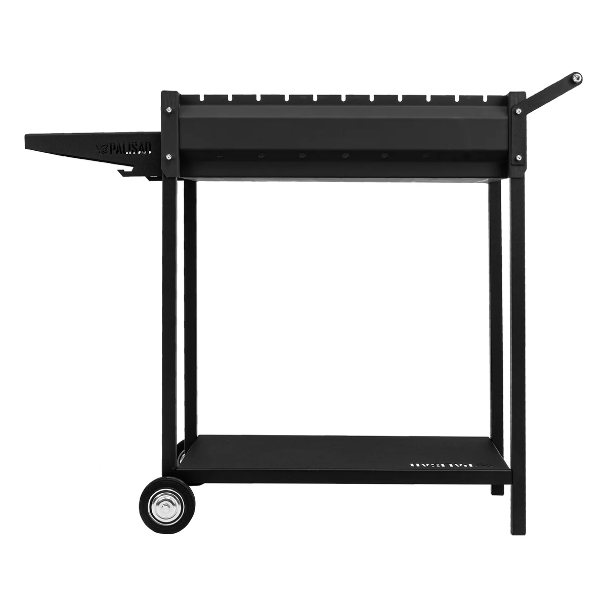 - Продуманная конструкция — на боковом столике можно разместить шампуры и другие аксессуары, а на нижней полке — посуду или запас топлива.