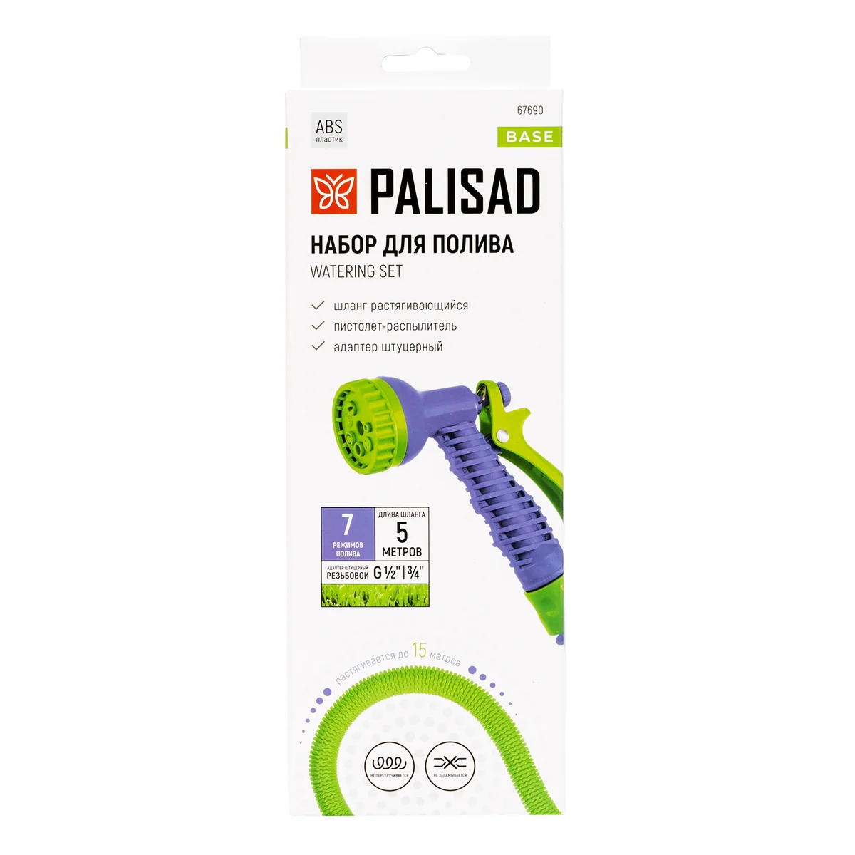 Поливочный набор Palisad включает усиленный шланг, растягивающийся до 15 м, 7-режимный пистолет, соединитель, адаптер, и предназначен для полива растительности на дачном участке, в парке, сквере. Представляет собой полностью готовую к работе систему. Соединитель с переходником позволяет подключать шланг к крану или отводу с резьбовым выходом диаметром 1/2" или 3/4".