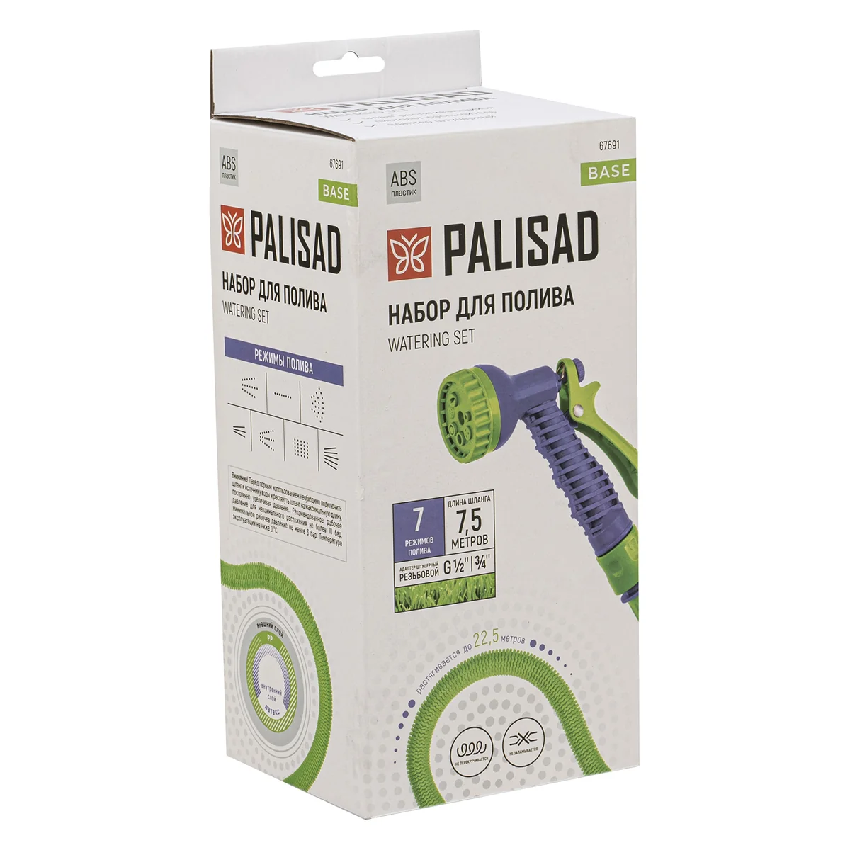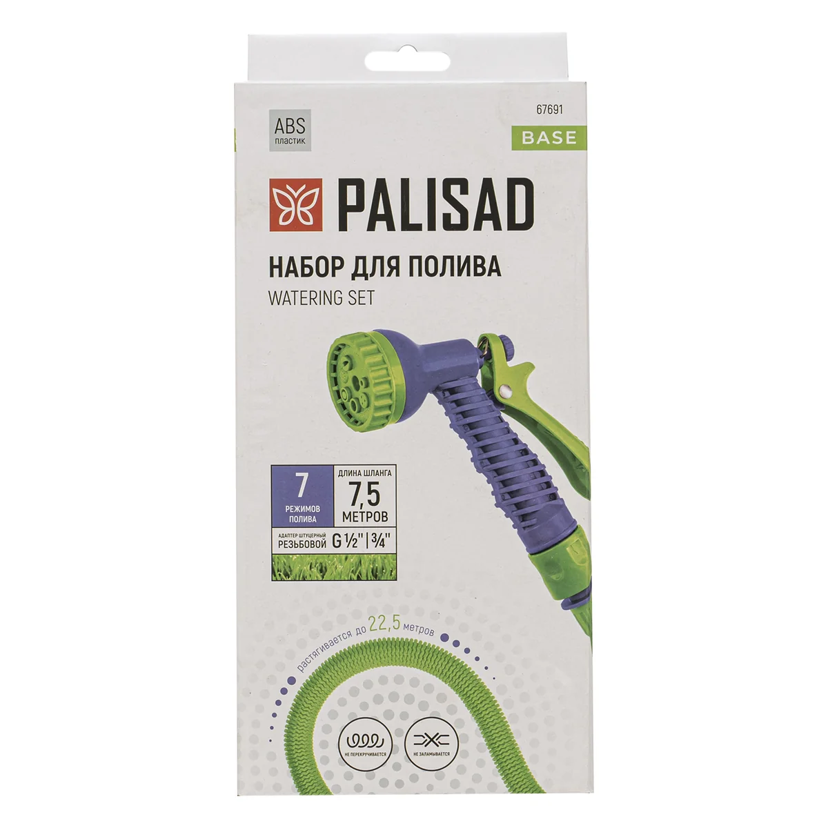 Поливочный набор Palisad включает усиленный шланг, растягивающийся до 22,5 м, 7-режимный пистолет, соединитель, адаптер, и предназначен для полива растительности на дачном участке, в парке, сквере. Представляет собой полностью готовую к работе систему. Соединитель с переходником позволяет подключать шланг к крану или отводу с резьбовым выходом диаметром 1/2" или 3/4".