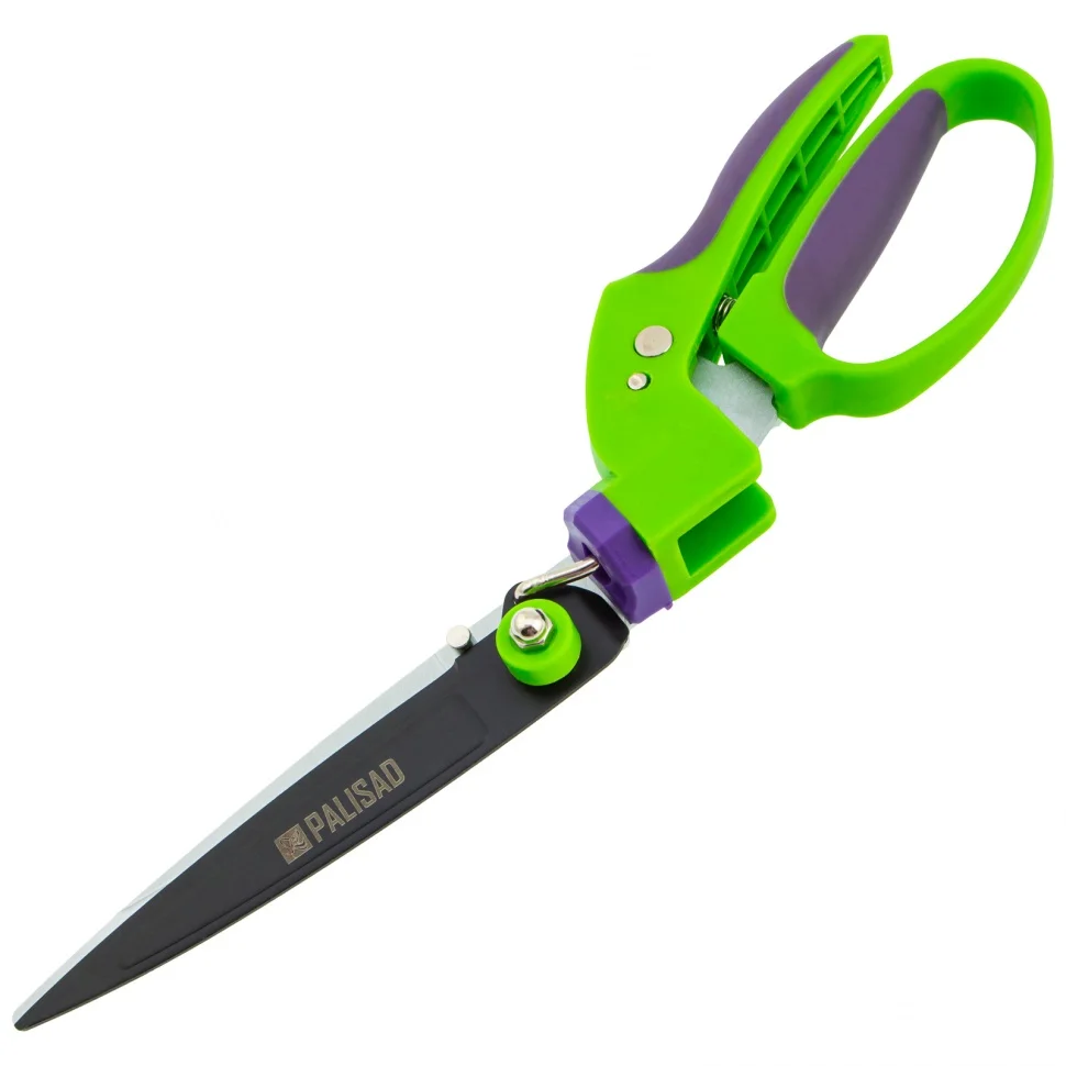 Газонные ножницы Palisad 60574 длиной 350 мм, с пластиковыми обрезиненными рукоятками, используют для подравнивания кромок газонов, стрижки травы вдоль дорожек, бордюров, ограждений, возле клумб и кустов. Рабочая часть поворачивается на 180 градусов, что упрощает работу в труднодоступных местах. Тефлоновое покрытие на верхнем лезвии облегчает рез и препятствует налипанию травяного сока и пыли. Благодаря механизму автооткрывания лезвия не заедает при подстригании жесткой травы. На нижней рукоятке имеется гарда, предохраняющая пальцы пользователя от ссадин, порезов и проколов. Ножницы пригодятся во время ухода за озелененными территориями.ПреимуществаКорпус выполнен из прочного полипропилена и не разрушается под действием ультрафиолета.Лезвия изготовлены из среднеуглеродистой стали, поэтому характеризуются прочностью и долговечностью.Закаленные рабочие кромки имеют твердость 43-46 HRC и остро заточены, поэтому обладают высокой режущей способностью.Верхнее лезвие имеет тефлоновое покрытие, а нижнее оцинковано, что защищает их от образования коррозии.Кнопочный фиксатор надежно удерживает лезвия в закрытом положении, обеспечивая безопасность хранения и транспортировки.При помощи регулировочного винта можно изменить плотность смыкания лезвий, подобрав оптимальный режим работы.Защитная накладка закрывает шарнир, препятствуя засорению механизма.Обрезиненные рукоятки не скользят в руке, обеспечивая комфорт во время работы.