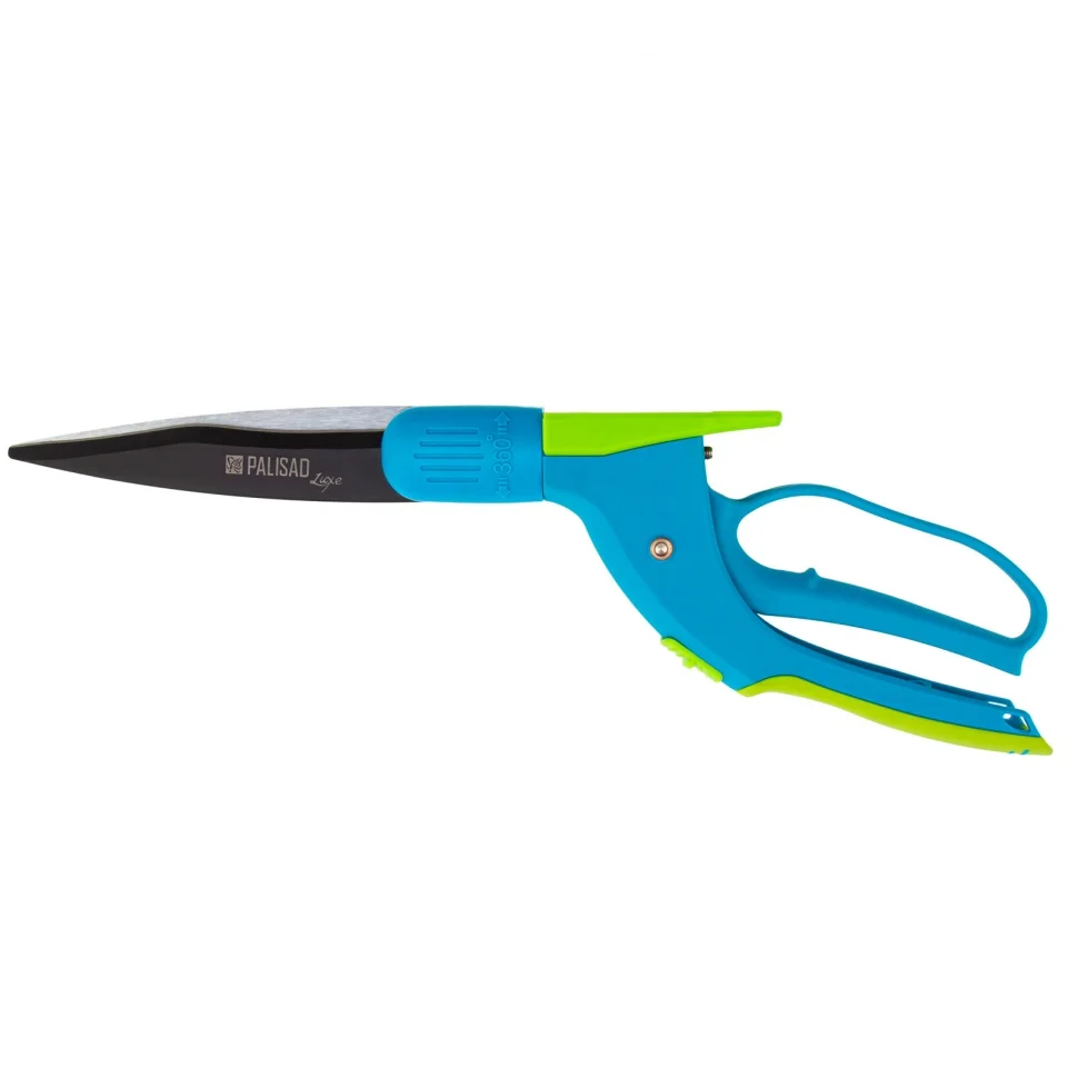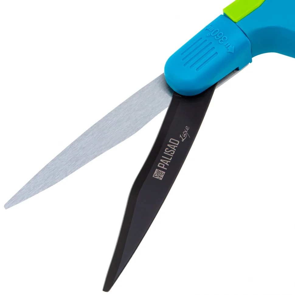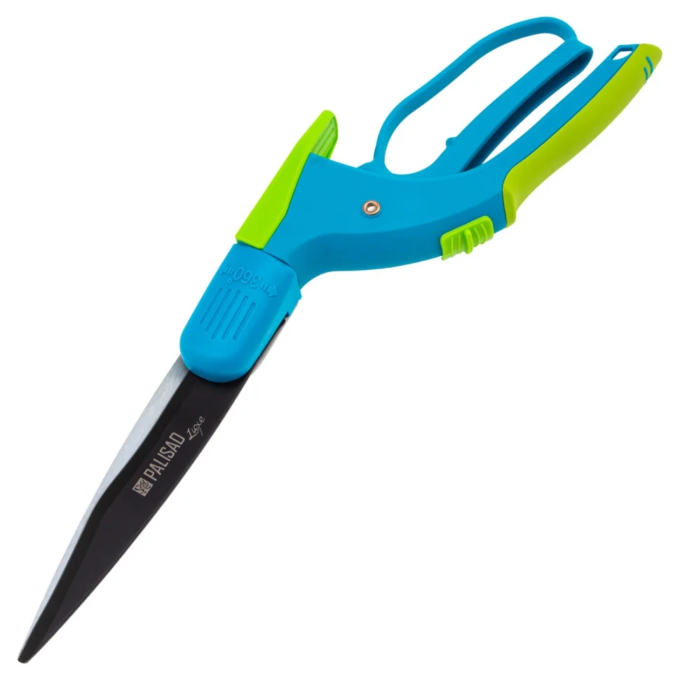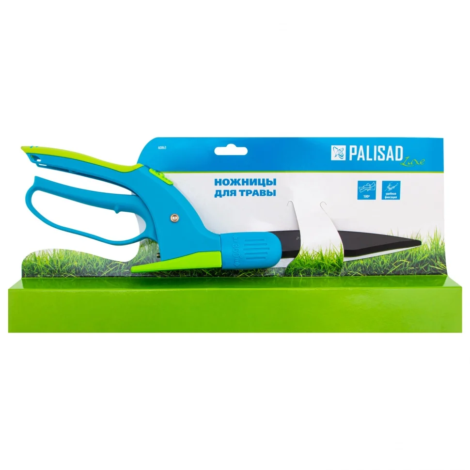 Газонные ножницы Palisad LUXE 60863 длиной 350 мм, с пластиковыми обрезиненными рукоятками, — инструмент для подстригания травы вдоль кромок газонов, дорожек, вдоль бордюров, ограждений, возле кустов. Поворотные на 180 градусов лезвия облегчают работу в труднодоступных местах. Гарда на нижней рукоятке защищает пальцы от царапин, проколов и ссадин. Механизм автооткрывания препятствует заеданию лезвий при стрижке жесткой травы. Ножницы помогут привести в порядок дачный участок или придомовую территорию.ПреимуществаКорпус изготовлен из прочного полипропилена, устойчивого к УФ-излучению, что увеличивает срок службы инструмента.Лезвия отличаются высокой прочностью и износостойкостью, т.к. изготовлены из высококачественной японской стали SK-5, легированной кремнием и кобальтом.Режущие кромки закалены до твердости 53-58 HRC и остро заточены, что обеспечивает износостойкость ножниц.Верхнее лезвие имеет тефлоновое покрытие, предотвращающее образование коррозии и облегчающее рез.Нижнее лезвие хромировано для защиты от ржавчины.У ножниц имеется фиксатор лезвий, удерживающий их в сомкнутом положении для обеспечения безопасности хранения и транспортировки.Регулировочный винт позволяет настроить плотность смыкания лезвий для повышения качества реза.Специальный колпачок защищает шарнир от попадания в механизм пыли и частиц срезанной травы.Рукоятки покрыты нескользящей термопластичной резиной, что обеспечивает надежный хват и повышает комфорт во время работы.