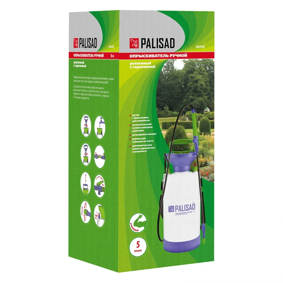 Ручной усиленный опрыскиватель Palisad 64745 вместительностью 5 л, с горловиной, насосом, шлангом и разбрызгивателем, используется для защиты садово-огородных культур от вредителей и болезней, а также для внесения удобрений. Предназначен для работы на дачном участке. Устройство обладает устойчивым дном и не опрокидывается. Опрыскиватель можно повесить на плечо, освободив руки для более комфортной работы. Бак обладает повышенной прочностью за счет усиленных стенок и дна. Благодаря широкой горловине можно быстро и аккуратно наполнить емкость раствором.ПреимуществаОпрыскиватель оснащен регулируемой распыляющей головкой, которая позволяет контролировать напор подачи жидкости.Курок снабжен фиксатором, удерживающим его нажатым для непрерывного распыления.Конструкцией предусмотрен автоматический клапан сброса избыточного давления, что обеспечивает безопасность во время работы.Водозаборный шланг оснащен фильтром, что предотвращает засорение форсунки и продлевает срок службы опрыскивателя.На баке имеется мерная шкала, облегчающая контроль расхода жидкости.Ручка насоса фиксируется и может использоваться для переноски опрыскивателя.