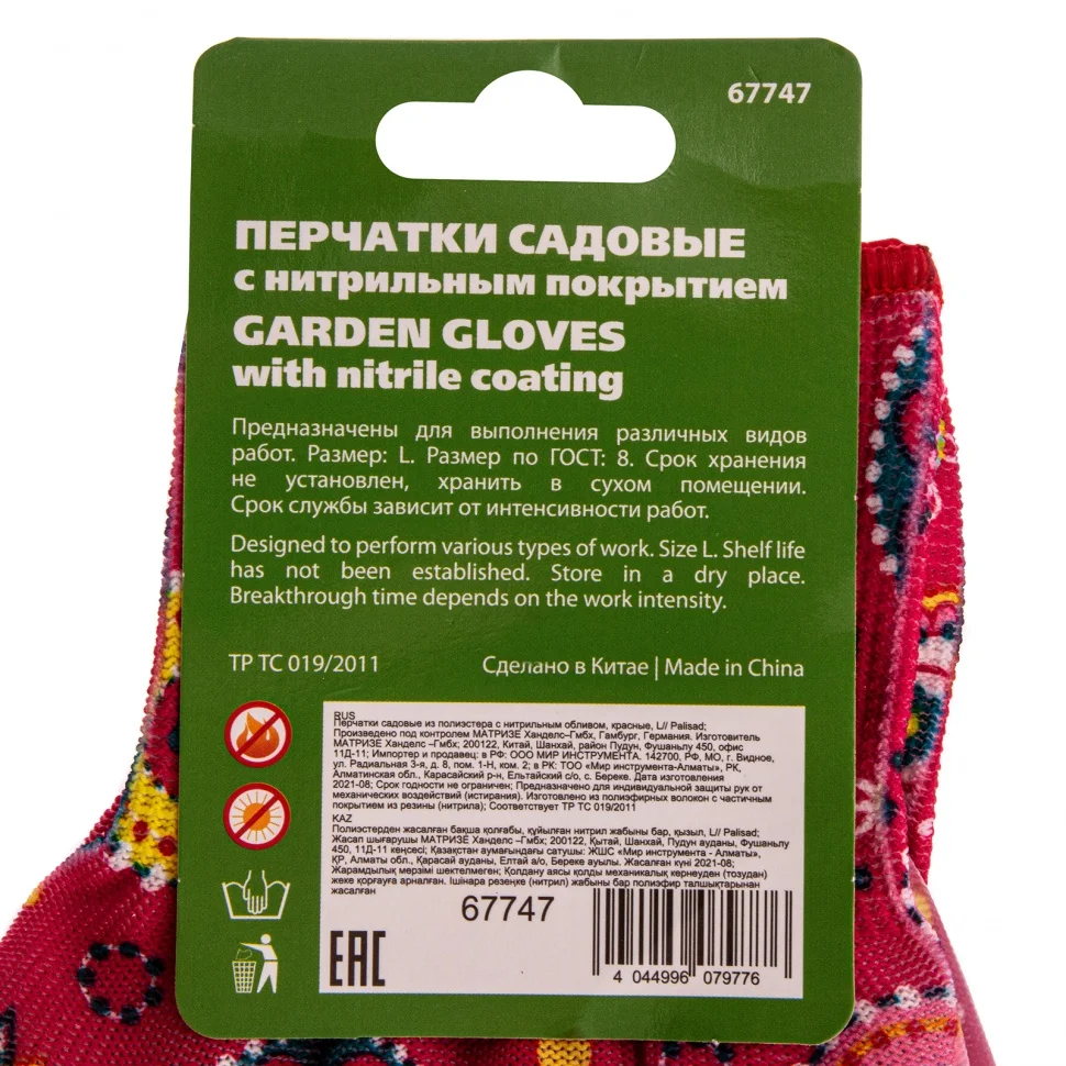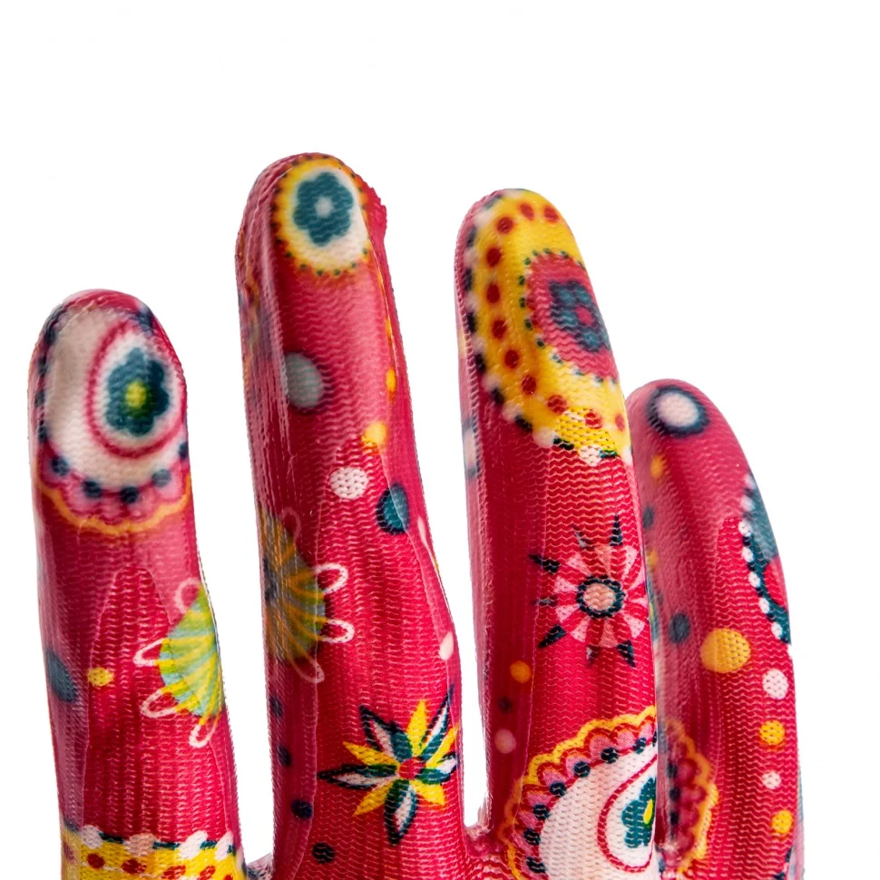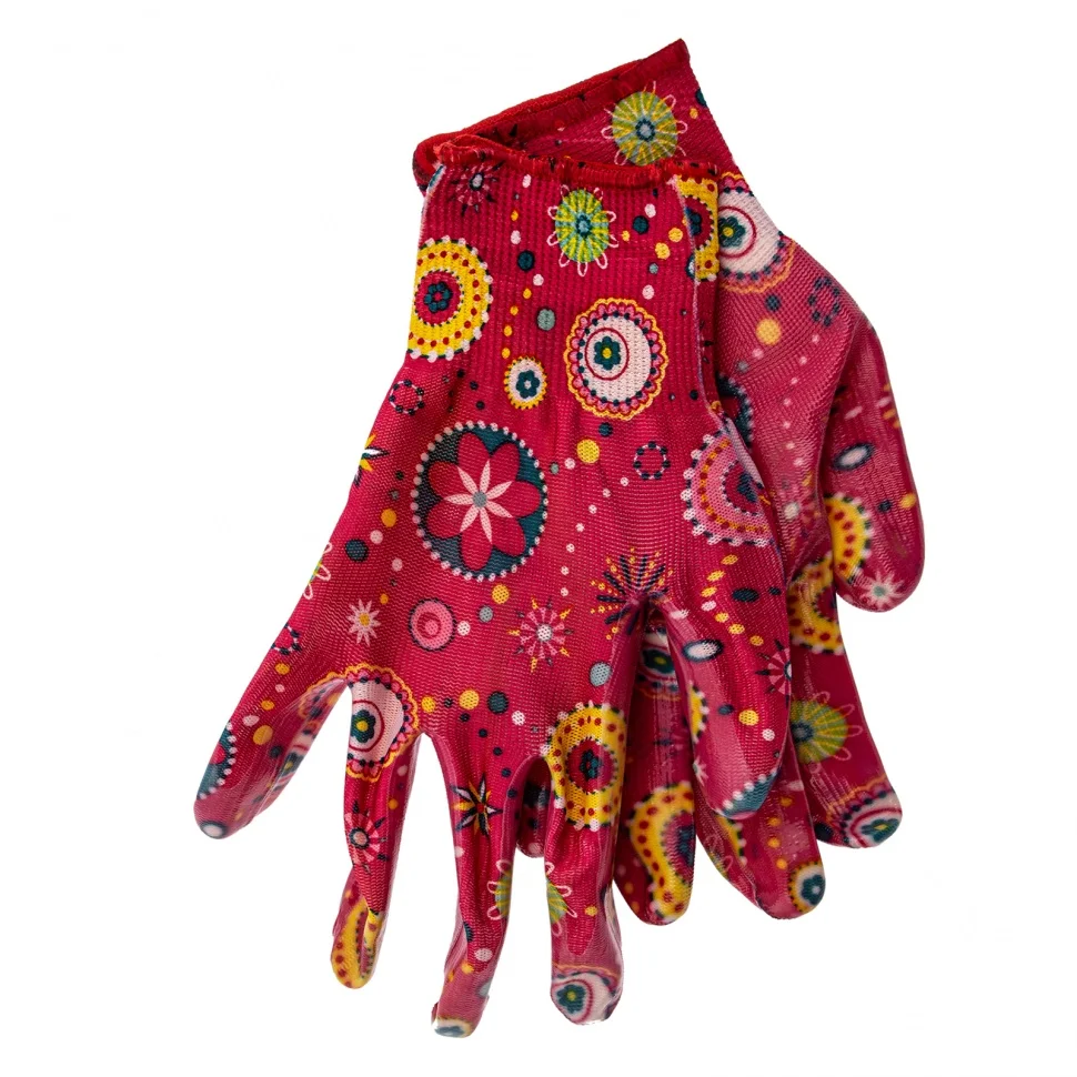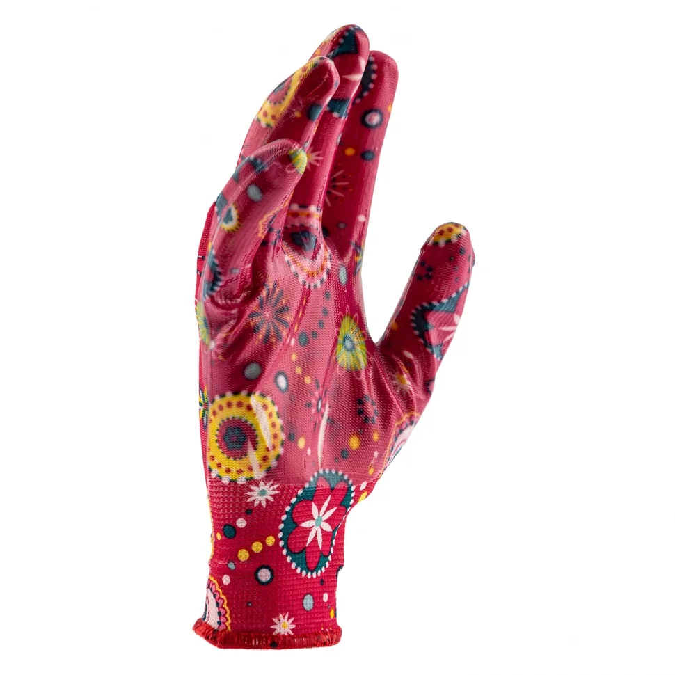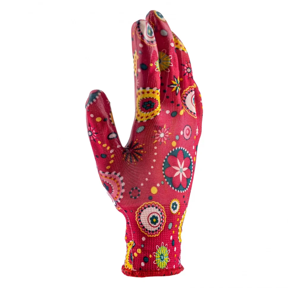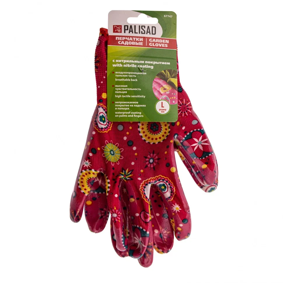 Красные садовые перчатки Palisad 67747 из полиэстера с нитрильным обливом, размер L, защищают руки от порезов, проколов, царапин, ссадин и намокания во время садово-огородных работ. Удобно садятся по руке, не стесняя движений. Перчатки пригодятся на дачном участке.ПреимуществаПолиэстер устойчив к истиранию и воздействию ультрафиолета, поэтому изготовленные из него перчатки прослужат долго.Нитрильное покрытие обеспечивает надежное сцепление с рабочей поверхностью, благодаря чему садовый инструмент не выскальзывает из рук.Эластичные манжеты плотно облегают запястья, поэтому перчатки не сползают с рук.Тонкое полотно обеспечивает хороший воздухообмен и тактильную чувствительность пальцев, что повышает комфорт во время работы.Края манжет обработаны на оверлоке, что предотвращает их распускание и продлевает срок службы перчаток.Материал основы не вызывает аллергии, поэтому использование перчаток безопасно для здоровья.Яркая расцветка привлекает внимание и повышает настроение, создавая благоприятную атмосферу во время работы.
