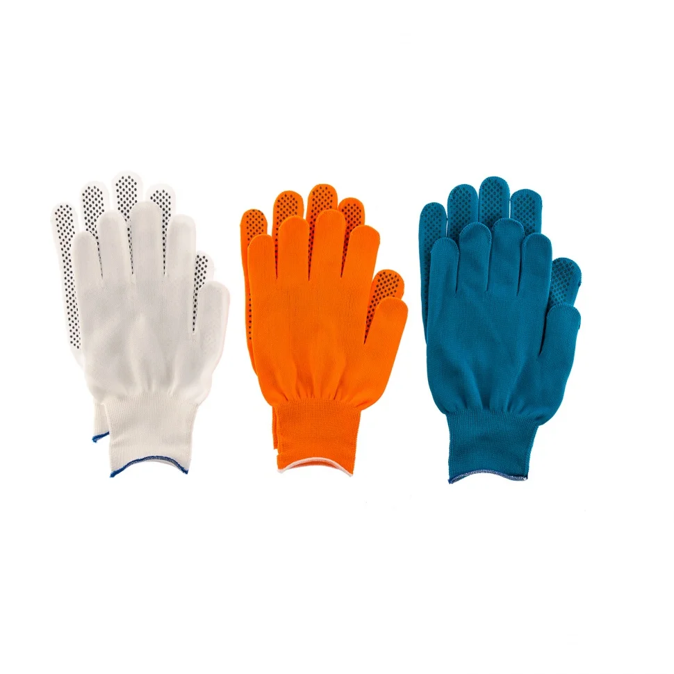Перчатки Palisad 67853 размера XL, с ПВХ-покрытием «Точка», входят в набор из 3 пар разных цветов — оранжевый, синий и белый. Используются при проведении садово-огородных и строительных работ, требующих точности движений. Защищают руки от царапин, порезов, ссадин и мозолей. Тонкое полотно обеспечивает высокую тактильную чувствительность пальцев. ПВХ-покрытие препятствует скольжению, помогая крепко удерживать инструменты и мелкие предметы. Перчатки будут полезны в профессиональной сфере и в быту.ПреимуществаПерчатки изготовлены из нейлоновой пряжи плотной вязки, поэтому они более износостойкие, чем хлопчатобумажные.Точечное покрытие из ПВХ увеличивает сопротивляемость перчаток истиранию, продлевая срок их службы.Материал перчаток обеспечивает улучшенный воздухообмен, позволяя коже рук дышать.Эластичные манжеты надежно фиксируются на запястьях, поэтому перчатки не сползают с рук.Ткань перчаток гипоаллергенна и приятна на ощупь, поэтому работать в них комфортно и безвредно для здоровья.Перчатки имеют яркую расцветку, что обеспечивает безопасность в условиях плохой видимости.
