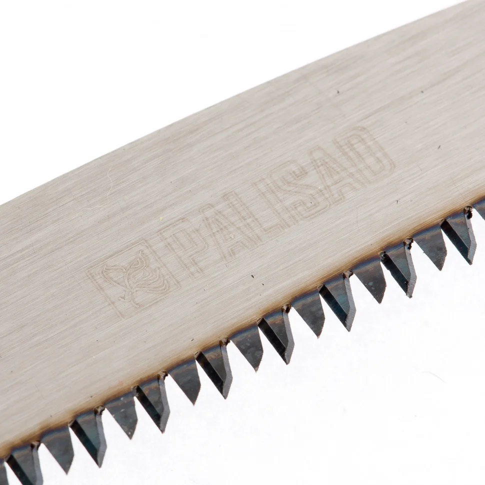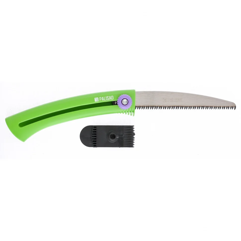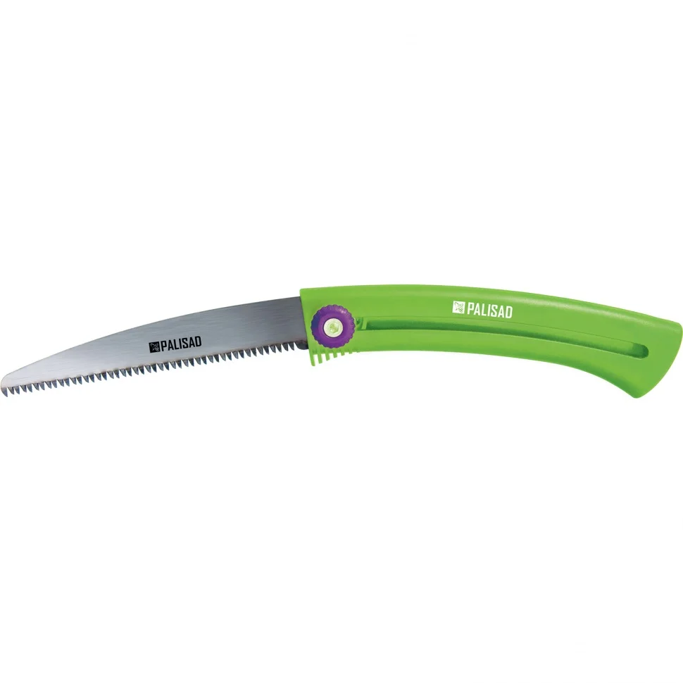 Выдвижная садовая пила Palisad 60410 с рабочей частью длиной 150 мм, с пластиковой рукояткой, предназначена для продольного и поперечного распила древесины и обрезки веток. Инструмент будет полезен строителям, садоводом и даже туристам. За счет выдвижной конструкции пила легко помещается в сумке и даже кармане, что позволяет брать ее с собой в поход. Дополнительный подвес для поясного ремня позволяет носить пилу с собой. Трехгранная заточка зубьев значительно облегчает работу, т.к. от мастера требуется небольшое усилие при пилении.ПреимуществаПолотно выполнено из прочной и долговечной рессорно-пружинной стали.Лаковое покрытие обеспечивает коррозионную стойкость полотна.Лезвие с мелким шагом зубьев TPI 9-10 оптимально подходит для обрезки живых ветвей, т.к. оставляет чистое место распила, а дерево при этом не теряет много сока.Зубья закалены, разведены и остро заточены, что обеспечивает высокую износостойкость пилы и предотвращает заклинивание полотна в древесине.В конструкции пилы предусмотрен винтовой фиксатор, позволяющий надежно закреплять лезвие на любой длине до 150 мм.Рукоятка пилы изготовлена из нейлона — прочного и износостойкого материала.Эргономичная рукоятка повышает комфорт работы и в то же время служит ножнами для полотна.Отверстие на рукоятке позволяет использовать специальный подвес для транспортировки пилы на поясе.