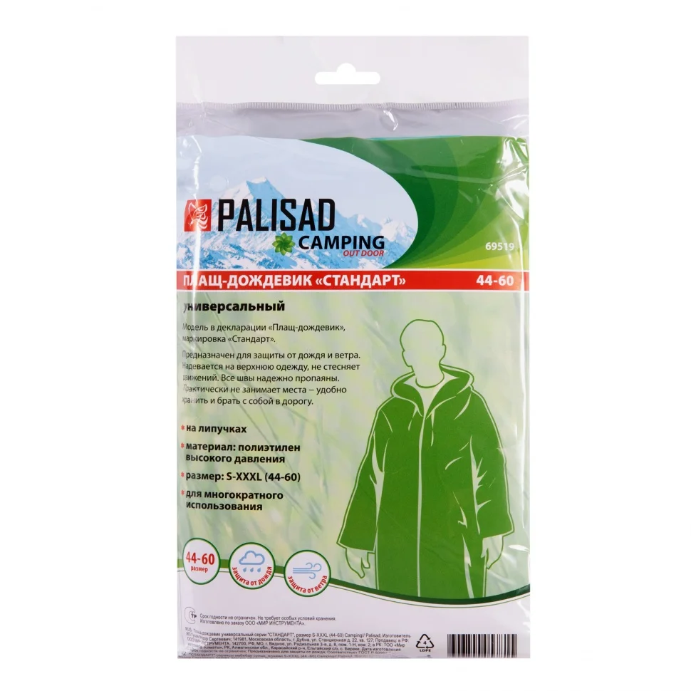 Универсальный плащ-дождевик Palisad Camping серии «Стандарт» 69519 рассчитан на размеры S-XXXL, российские 44-60, и используется для защиты от ветра и дождя. Имеет капюшон, закрывающий голову. Надевается на верхнюю одежду, не мешая при этом двигаться. Пригодится на прогулке, в походе за грибами, на пикнике или рыбалке.ПреимуществаДолговечность — плащ изготовлен из полиэтилена высокого давления толщиной 35-40 мкм, устойчивого к механическим повреждениям, поэтому подходит для многократного применения.Прочность — крепко прошитые швы повышают сопротивляемость разрыву.Удобные застежки — дождевик застегивается на липучки, что упрощает его надевание.Компактность — плащ легко складывается и весит 130 г, поэтому его можно положить в сумку или рюкзак.