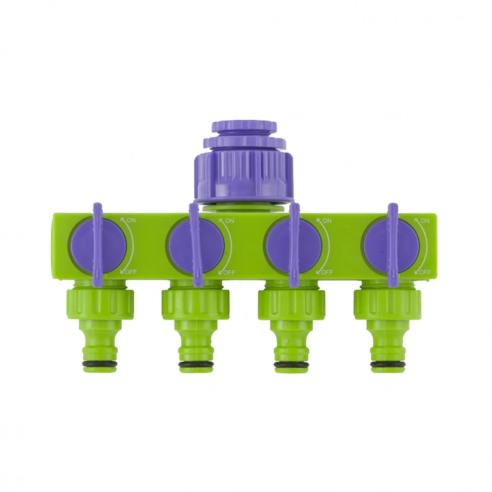 Регулируемый четырехканальный разветвитель Palisad 66425 подключает 4 магистрали к водопроводному отводу или крану диаметром 1/2 или 3/4 дюйма. Переходник входит в комплект. Разветвитель позволяет использовать шланги разного диаметра и будет полезен для организации системы орошения на участке большой площади.ПреимуществаРазветвитель изготовлен из высокопрочного ABS-пластика, поэтому устойчив к повреждениям и не подвержен коррозии.Конструкцией предусмотрены поворотные регуляторы, при помощи которых можно включать, изменять и отключать напор воды.Универсальный штуцерные выходы подходят для адаптеров и быстросъемных соединителей всех систем полива Palisad.