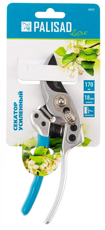 Усиленный секатор прямого реза Palisad LUXE 60529 длиной 170 мм, с нижней рукояткой в ПВХ-оболочке, используется для обрезки живых веток толщиной до 18 мм. Обладает повышенной мощностью благодаря шарниру особой конструкции, увеличивающему усилие сжатия на 10%. Регулировочный винт позволяет изменить плотность смыкания лезвий. Секатор пригодится для работы на загородном участке.ПреимуществаЛезвия изготовлены из высококачественной японской инструментальной стали SK-5, поэтому характеризуются повышенной прочностью и износостойкостью.Рабочие кромки движутся параллельно друг другу, обеспечивая минимальное повреждение растения при обрезке.Индукционная закалка и прецизионная заточка режущей кромки обеспечивают ей высокий ресурс работоспособности.Режущее лезвие имеет тефлоновое покрытие, защищающее от ржавчины, а также снижающее силу трения и облегчающее работу с инструментом.Цинковое покрытие опорного лезвия предотвращает образование на нем коррозии, что повышает долговечность секатора.Фиксатор, удерживающий лезвия в сомкнутом положении, не дает им раскрыться во время хранения или транспортировки.Литые алюминиевые рукоятки выдерживают значительные нагрузки, что делает инструмент оптимальным приспособлением для работы в саду и огороде.Нижняя рукоятка с ПВХ-покрытием надежно лежит в руке, что повышает комфортность работы.