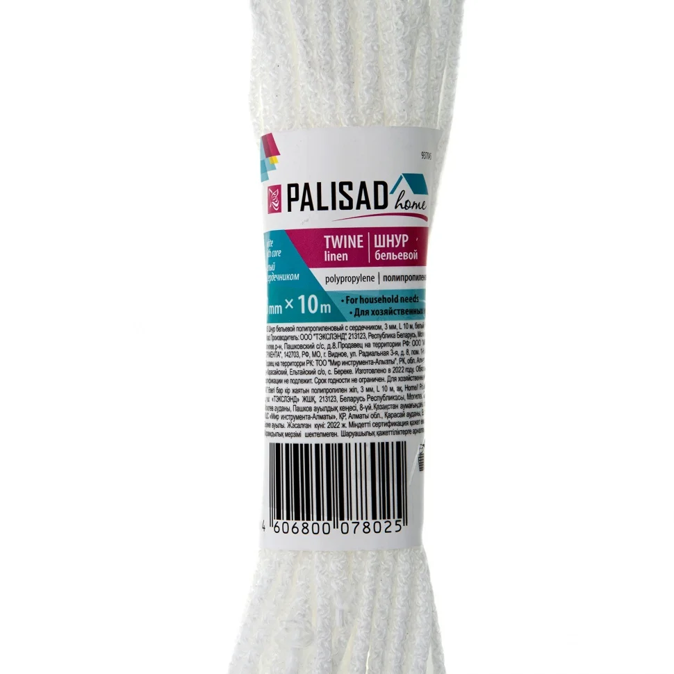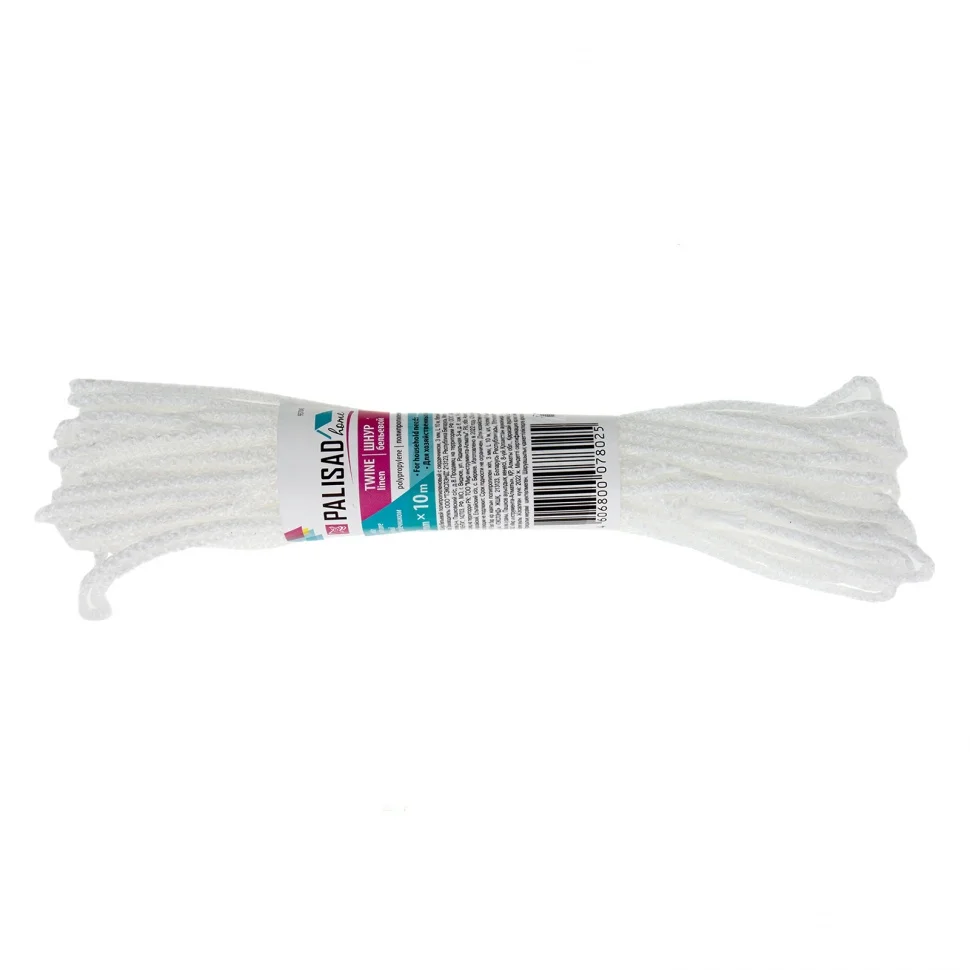 Белый полипропиленовый бельевой шнур Palisad Home 937045 с сердечником, диаметром 3 мм и длиной 10 м, используется для сушки белья, а также в качестве хозяйственной веревки в быту, на рыбалке или в походе. От обычной бельевой веревки для сушки он отличается сердечником из полипропилена, увеличивающим стойкость к нагрузкам. Шнур с полипропиленовой оплеткой выдерживает разрывную нагрузку до 30 кгс, устойчив к растяжению и не провисает под весом мокрых вещей.ПреимуществаШнур изготовлен из полипропилена, не гниет и не разрушается под действием агрессивных сред, что увеличивает срок его службы.Изделие устойчиво к износу, выдерживает многократное изгибание, поэтому рассчитано на длительное использование.Веревка для белья из полипропилена с сердечником устойчива к температурным перепадам, поэтому ее можно использовать как в помещении, так и под открытым небом.Благодаря мягкости и эластичности бельевой трос легко завязывать узлом.