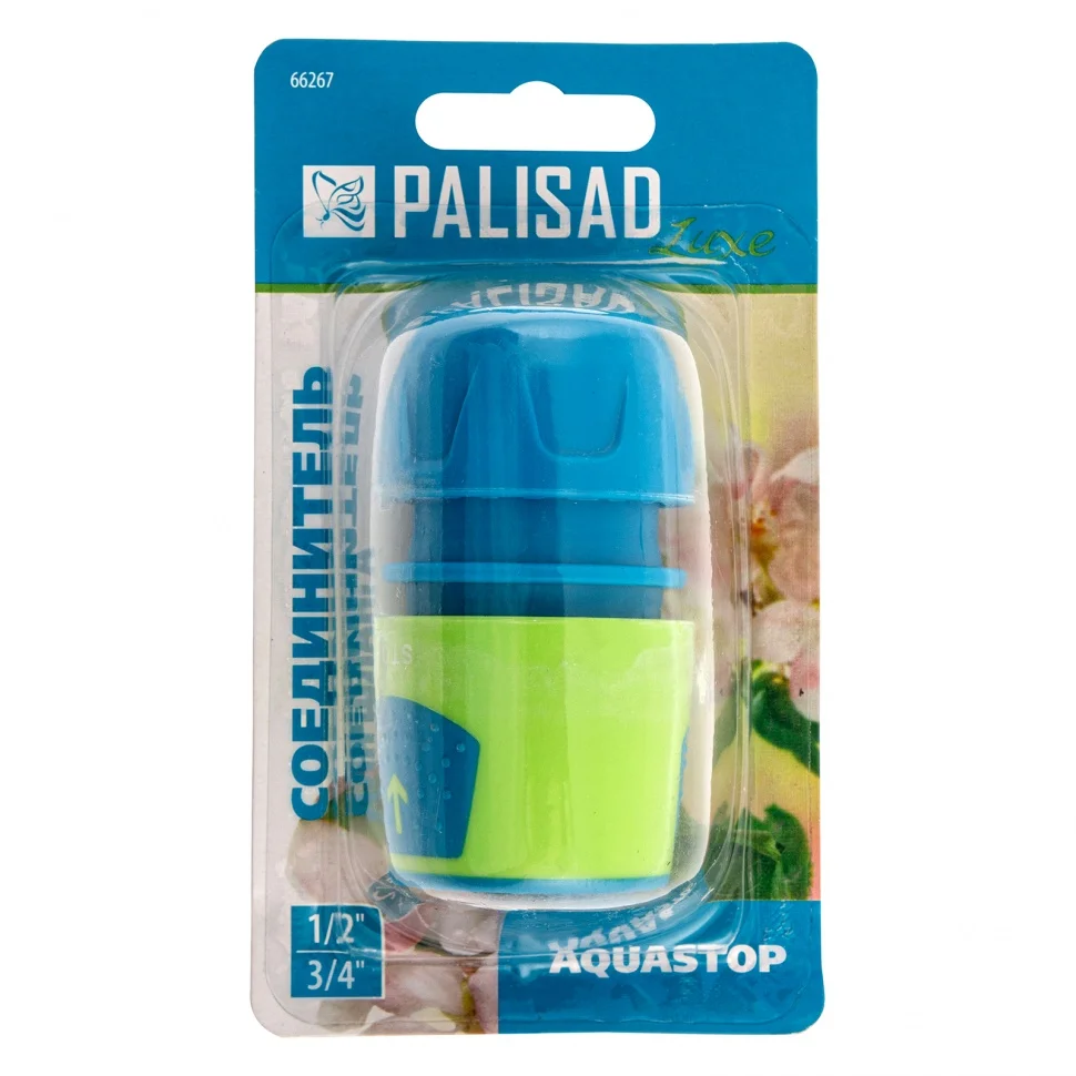 Быстросъемный соединитель Palisad LUXE 66267 из ABS-пластика, с функцией «аквастоп», используется для установки насадок на шланги диаметром 1/2 и 3/4"". Не требует использования дополнительных инструментов. Будет полезен дачникам для организации полива сада и огорода.ПреимуществаВысокая прочность — соединитель изготовлен из ABS-пластика.Клапан «аквастоп» — подача воды мгновенно прекращается при отсоединении насадки.Удобное размещение на стенде — изделие поставляется с подвесной картой.
