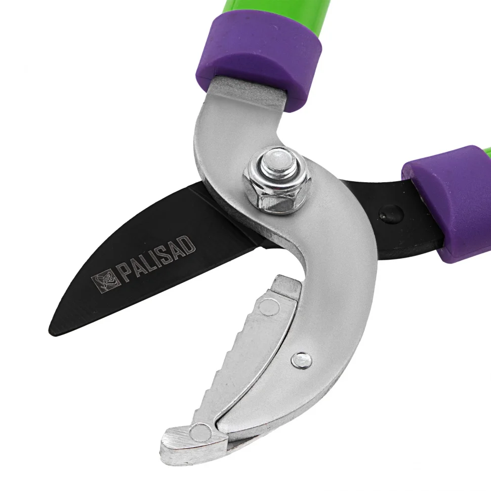 Сучкорез с наковальней Palisad 60571 длиной 530 мм, со стальными обрезиненными рукоятками, предназначен для срезания сухих и увядших веток толщиной до 25 мм. Инструмент удерживают двумя руками. Рабочее лезвие остро заточено и имеет тефлоновое покрытие, благодаря чему легко справляется со своими задачами. Сучкорез пригодится владельцам загородных участков.ПреимуществаРежущее лезвие из углеродистой стали устойчиво к износу, поскольку прошло индукционную закалку.Защиту от ржавчины обеспечивает антикоррозионное покрытие — из порошковой эмали на стальной наковальне и рукоятках и тефлоновое на режущем лезвии.Инструмент надежно фиксирует ветку во время обрезки, поскольку опорная наковальня имеет рифленую поверхность.Плотность смыкания лезвий регулируется посредством регулировочного винта.Рукоятки устойчивы к изгибу и излому, т.к. изготовлены из стальной профильной трубы.Работать сучкорезом комфортно, поскольку на рукоятках имеются нескользящие прорезиненные накладки.