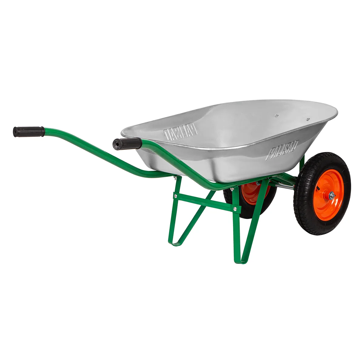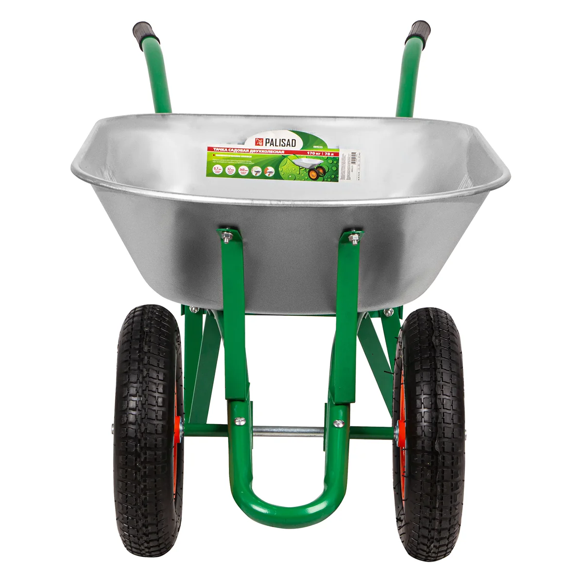 Садовая тачка Palisad 689225 с двумя колесами, грузоподъемностью 170 кг и с кузовом объемом 78 л, рассчитана на транспортировку садовых и легких строительных грузов. Избавляет от необходимости ручного перемещения тяжестей и позволяет снизить нагрузку на спину.