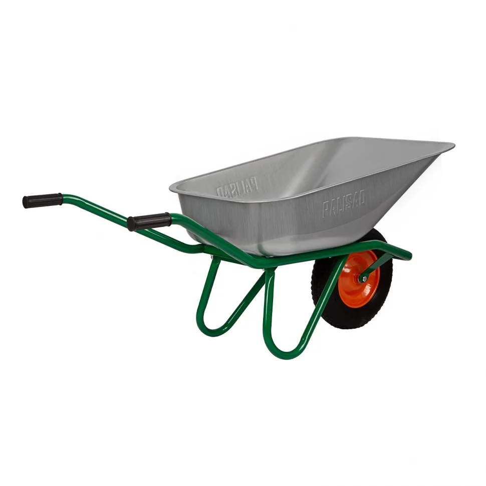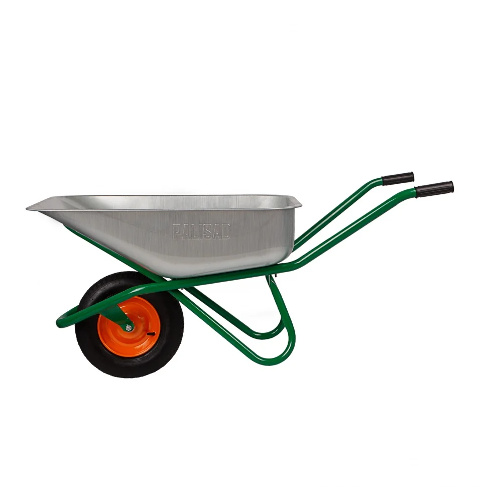 Усиленная садово-строительная тачка Palisad 689183 с кузовом объемом 90 л и грузоподъемностью 200 кг позволяет транспортировать строительные материалы, удобрения, урожай и другие грузы. Рассчитана на интенсивную эксплуатацию, подходит для выполнения большого объема работ. Тачка используется в строительстве и сельском хозяйстве.ПреимуществаУвеличенная прочность — рама выполнена из стальных труб диаметром 32 мм и толщиной 1,2 мм, а кузов — из стали толщиной 0,7 мм.Надежность — завальцованные борта обеспечивают ударостойкость верхнего края кузова.Защита от коррозии — кузов оцинкован, а на раму, опору и диск колеса нанесено порошковое покрытие.Маневренность и хорошая проходимость — тачку с одним пневматическим колесом на 2-х шариковых подшипниках удобно перемещать и разворачивать.Высокая грузоподъемность — благодаря дополнительной опоре кузов выдерживает до 200 кг.Удобная фронтальная разгрузка — в конструкции тачки предусмотрен передний упор.Ремонтопригодность — изношенное колесо можно заменить, совместимые артикулы 68947, 68978.