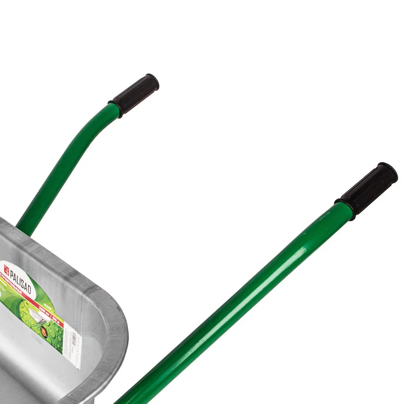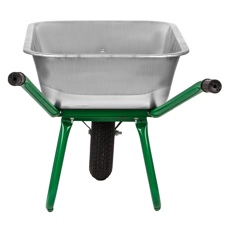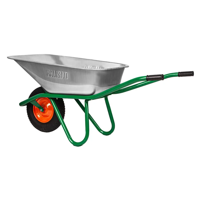 Садово-строительная тачка Сибртех 689850 грузоподъемностью 200 кг и объемом корыта 90 л будет полезна во время строительства или ухода за дачным участком. Ее используют для перемещения мусора, веток, листьев, грунта, щебня, песка, а также строительных смесей. Необходимая грузоподъемность достигается благодаря стальной раме с толщиной стенок 1,2 мм и кузову со стенками толщиной 0,7 мм. Кузов установлен на одно колесо, что увеличивает маневренность тачки. 2 шарикоподшипника облегчают вращение колеса, поэтому тачку легко перемещать по неровной поверхности. Преимущества:верхний край стального корыта плотно подогнут, что повышает его деформационную стойкостькорыто оцинковано, а рама, опоры и колесный диск покрыты порошковой эмалью, защищающей их от коррозиипереднюю часть кузова поддерживает дополнительная опора, поэтому тачка выдерживает вес до 200 кгпневматическое колесо с камерой и резиновой шиной гасит вибрации и обеспечивает плавность хода, что повышает комфортность использования тачкив передней своей части рама образует дугу, которая защищает колесо и образует упор при фронтальной разгрузке