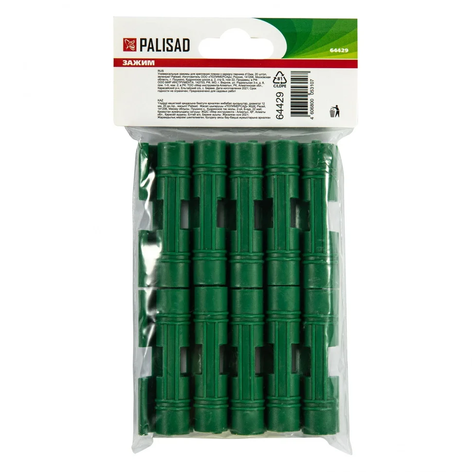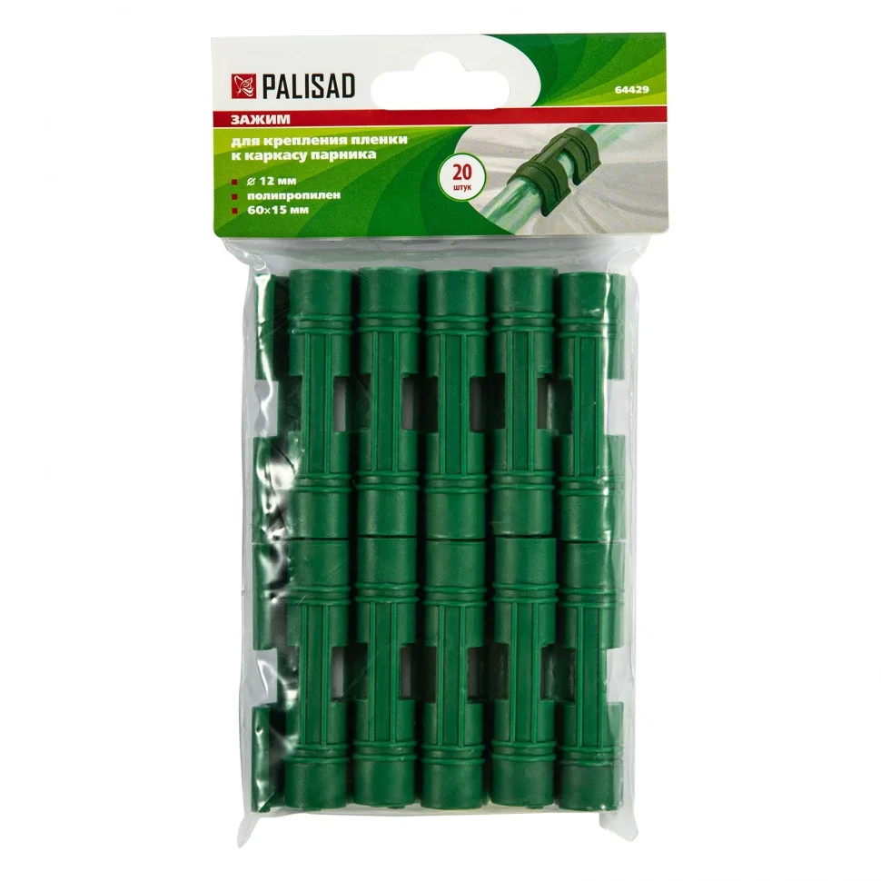 Универсальные зажимы для крепления пленки к каркасу парника диаметром 12 мм Palisad 64429, зеленые, 20 шт./уп., используются в садоводстве и огородничестве. Они не дают укрывному материалу сорваться с дуг и служат для укрепления конструкции парника и защиты рассады от климатических воздействий.ПреимуществаДолговечность - зажимы изготовлены из высококачественного пластика, устойчивого к ультрафиолету и влаге.Зажимы будут сохранять рассаду в течение нескольких сезонов, т.к. предназначены для многократного использования.Простая установка - зажимы надежно крепятся на дуги за несколько секунд и не повреждают пленку.