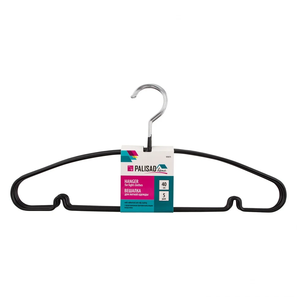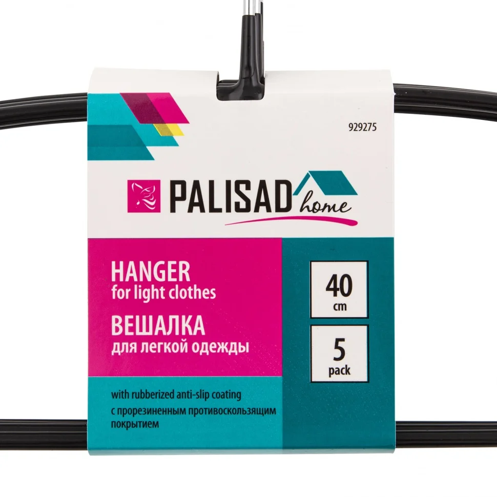 Комплект Palisad Home 929275 включает в себя 5 вешалок с прорезиненным противоскользящим покрытием, длиной 40 см каждая, обеспечивающих бережное хранения легкой одежды: блузок, рубашек, летних брюк и др. Специальная перекладина позволяет подвешивать брюки. А мягкое резиновое покрытие на плечиках и перекладине не допускает соскальзывания одежды и появления на ней заломов.ПреимуществаИзделия выполнены из стали, поэтому отличаются прочностью и долговечностью.На нижней перекладине каждой вешалки имеются специальные выступы для размещения трикотажных вещей.5 вешалок в наборе хватит на несколько комплектов одежды.