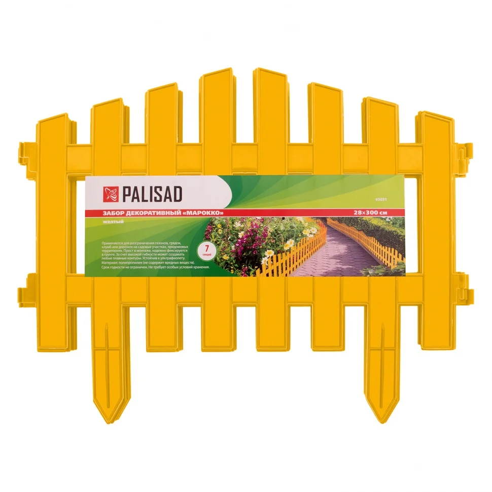 Декоративный забор Palisad «Марокко» 65031 желтого цвета, 28 х 300 см, позволяет обозначить границы зеленых насаждений и грядок, оградить дорожки и зоны отдыха. В комплекте 7 секций общей длиной 300 см, которые помогут придать аккуратный и завершенный вид придомовой территории или дачному участку.ПреимуществаЗабор устойчив к воздействию ультрафиолета и осадков, т.к. изготовлен из прочного полипропилена.На протяжении всего срока использования и независимо от времени года геометрические пропорции секций сохраняются.Заостренные ножки легко фиксируются в грунте без применения инструментов.Можно оформить участок любой формы, поскольку секции имеют подвижное соединение.