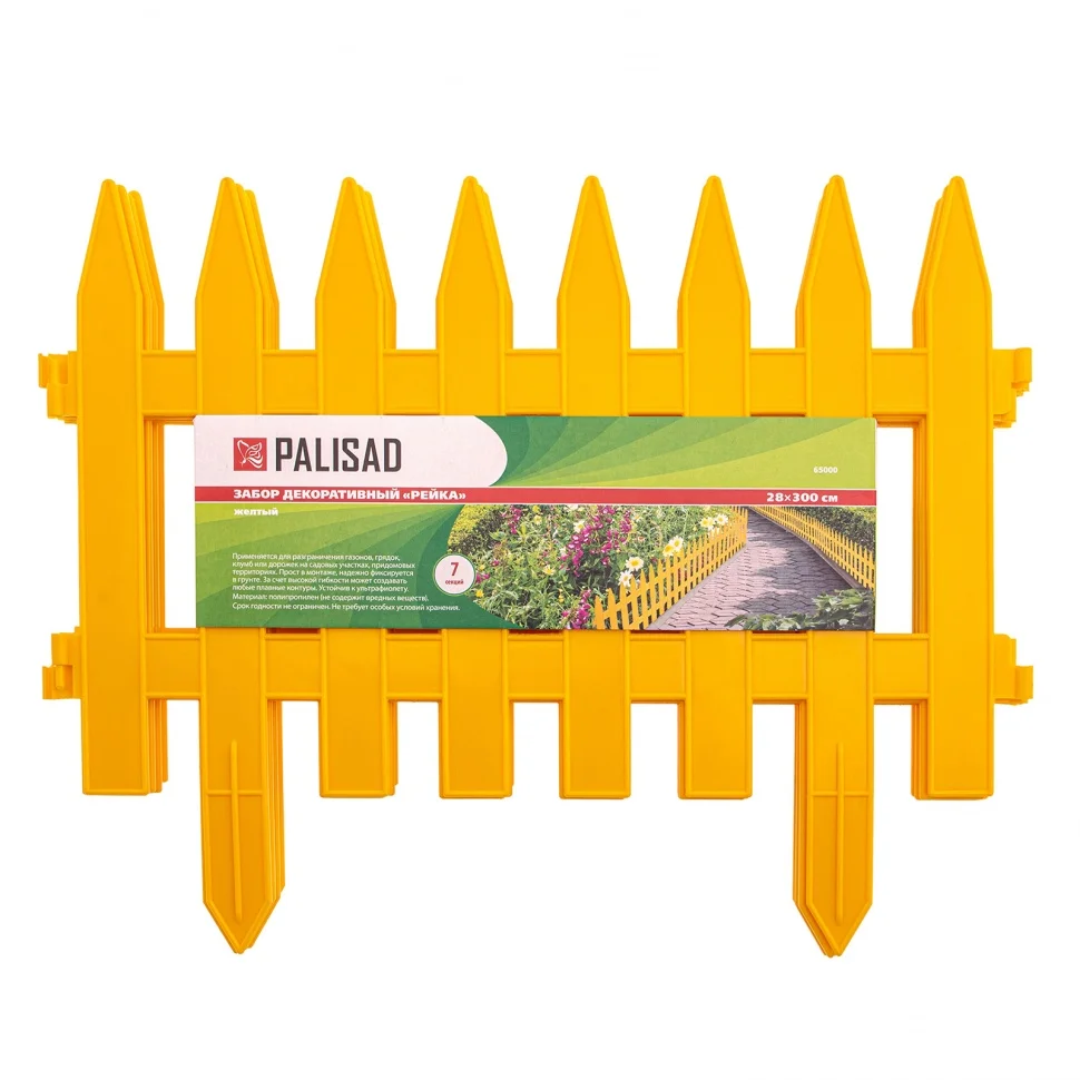 Желтый декоративный забор Palisad «Рейка» 65000, 28 х 300 см, позволяет подчеркнуть отдельные зоны озелененной территории. В комплекте 7 оригинальных секций, которые позволяют оформить цветники и грядки, обозначить границы дорожек, оградить деревья и кусты. С заборчиком ландшафт принимает завершенный вид.ПреимуществаУстановка очень проста за счет заостренных ножек, которые фиксируются в грунте.Забор устойчив к воздействию снега, дождя и солнечных лучей, т.к. изготовлен из высококачественного полипропилена.Возможность огораживать фигурные участки - соединение секций забора подвижно.Первоначальный вид - независимо от срока использования и погодных условий забор сохраняет геометрическую форму.Экологическая безопасность - материал забора безвреден для почвы и для человека.