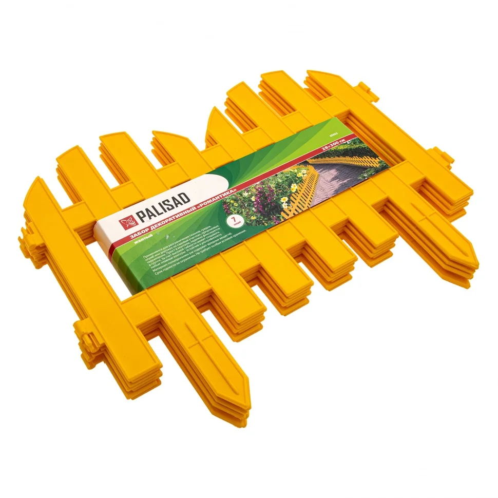 Желтый декоративный забор Palisad «Романтика» 65023, 28 х 300 см, позволяет обозначить границы отдельных участков озелененной территории - дорожек, клумб, грядок, приствольных кругов деревьев. В комплекте 7 секций общей длиной 300 см. Заборчик украсит дачный участок и придаст ему завершенный вид.ПреимуществаЗабор изготовлен из высококачественного полипропилена, поэтому устойчив к воздействиям внешней среды и сохраняет первоначальный вид на протяжении всего срока службы.Для установки не требуются инструменты и специальные навыки - достаточно соединить секции между собой и погрузить заостренные ножки в землю.Забор подходит для ограждения участков любой формы благодаря подвижному замковому соединению.