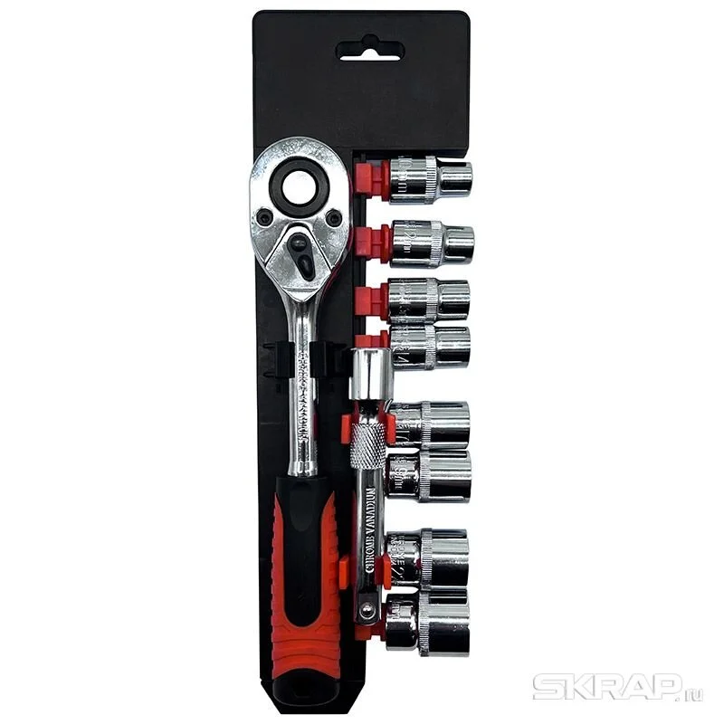 Набор Состав набора: Трещотка реверсивная 1/2 24 зубца Удлинитель 1/2 дюйма 125 мм Торцевые головки на 1/2 8 шт: 10-12-13-14-17-19-22-24мм Материал: Crv двухкомпонентая рукоятка Материалы: 35K закаленная углеродистая сталь (42-45HRС), PP, PE Упаковка: пластиковый подвес
