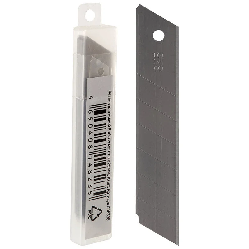 В упаковке: 10 шт Размер: 25х100мм, толщина: 0,7 мм Материал: сталь Упаковка: пластиковый бокс с подвесом Лезвие состоит из нескольких сегментов, каждый из которых имеет свою режущую кромку. Если лезвие затупилось, то, обломив один сегмент, можно продолжить работу новой режущей кромкой.