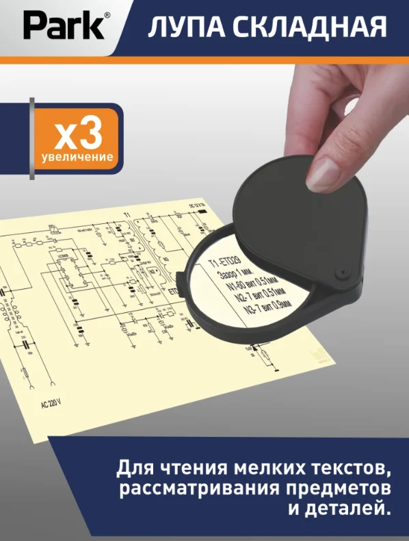 Диаметр линзы: 6 см Увеличение x3 Материал: пластмасса, акрил Габариты без упаковки: 85x64x15 мм Упаковка: коробка Складная лупа с трехкратным увеличением будет полезна в быту во время чтения или рукоделия. За счет складной конструкции удобно брать с собой в поездки.