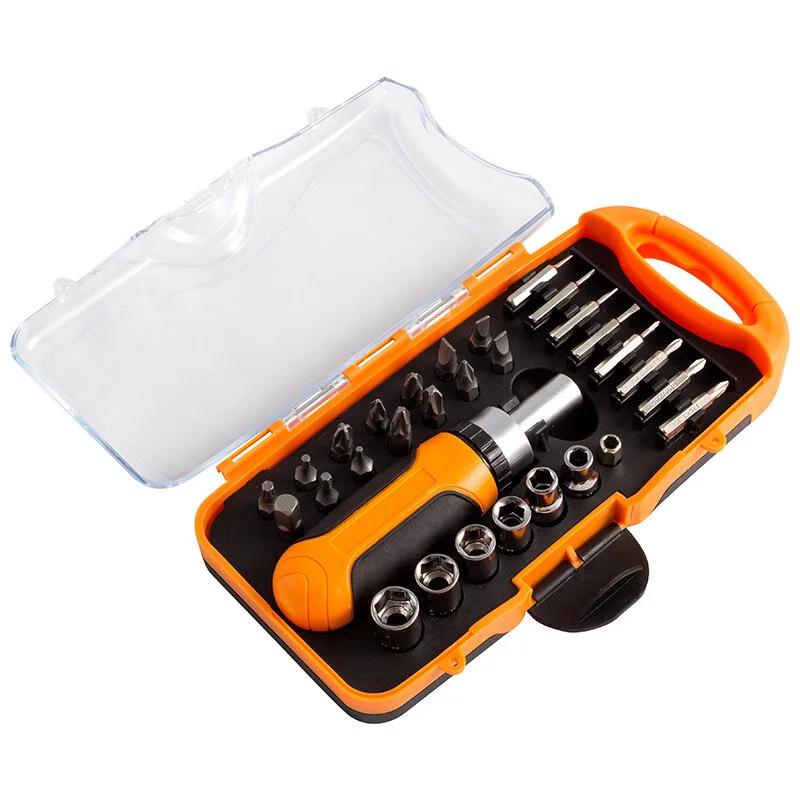 в наборе -Биты 25 мм - 13 шт: PН1, PH2, PH3 SL4, SL5, SL6 PZ1, PZ2, PZ3 T10, T15, T20, T25 - адаптер - Биты прецизионные 28 мм - 8 шт РН000, PH00, PH0, PH1 SL1, SL1,5, SL2 SL2.5 - торцевые головки - 6 шт: 5мм, 6мм, 7мм, 8мм, 9мм, 10мм - адаптер для крепления торцевых головок - ручка для отвертки-трещотки - 1 шт - пластиковый кейс материалы:карбоновая сталь, хром-ванадиевая сталь,полипропилен, термопластичная резина" Упаковка: пленка, цветной стикер