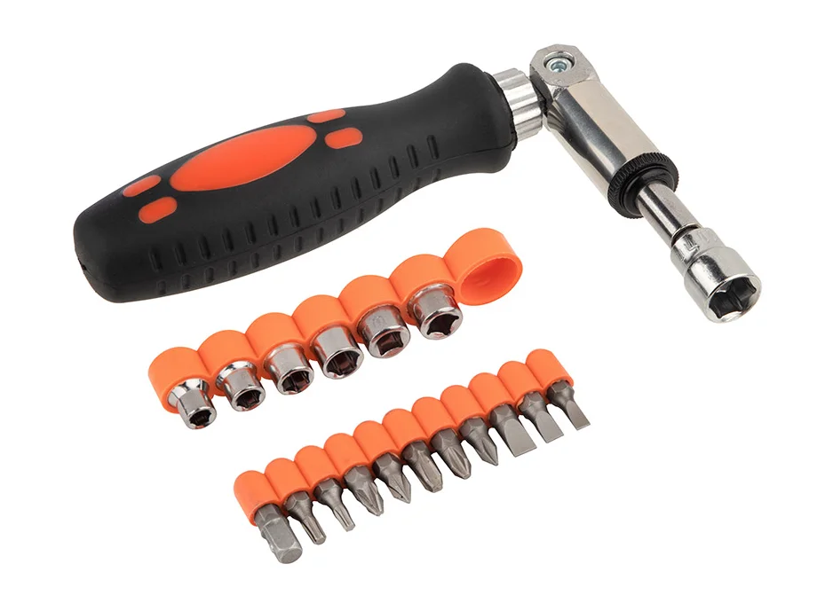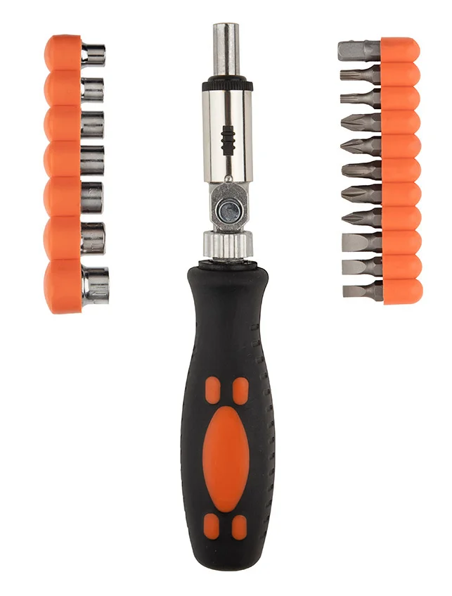 В наборе: - отвертка реверсивная с шарниром - торцевые головки - 7 шт: 5мм, 6мм, 7мм, 8мм, 9мм, 10мм, 11мм - биты 25 мм -10 шт: PH1, PH2, PH3 PZ1, PZ2 SL4, SL5, SL6 T15, T20 - адаптер 1/4 Материалы: углеродистая сталь, пластмасса Упаковка: блистер