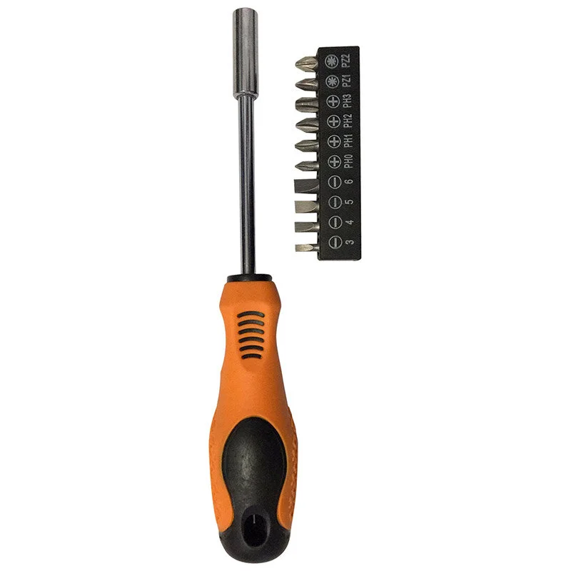 в наборе: - отвертка - биты 10 шт SL3,SL4,SL5,SL6 PH0,PH1,PH2,PH3 PZ1,PZ2 материалы: хром-ванадиевая сталь, полипропилен, термопластичная резина упаковка - блистер