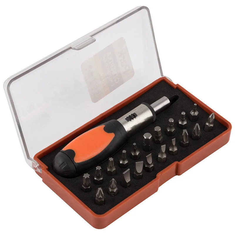 В наборе: - отвертка-трещотка -биты 25 мм - 20 шт: PH1, PH2, PH3 PZ1, PZ2 SL3, SL4, SL5, SL6, SL7 H2, H3, H4, H5, H6 T10, T15, T20, T25, T30 - пластиковый кейс материалы: хром-ванадиевая сталь, полипропилен, термопластичная резина Упаковка: пленка, 2 цветных стикера