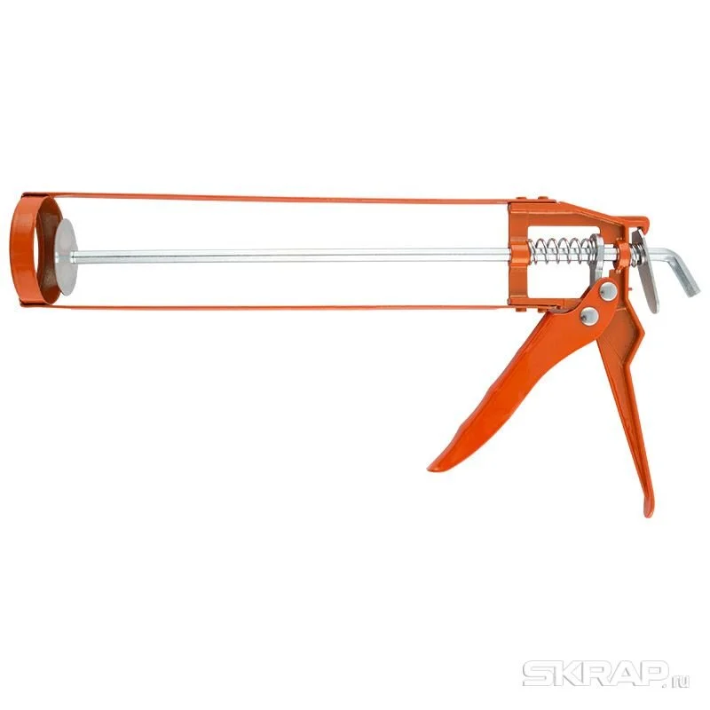 Тип корпуса: скелетный Материал корпуса: металл Вес: 260 г Упаковка: пакет и стикер Скелетный пистолет для герметика используется при строительных и ремонтных работах. Предназначен для выдавливания герметиков или клеев, расфасованных в пластиковые тубы