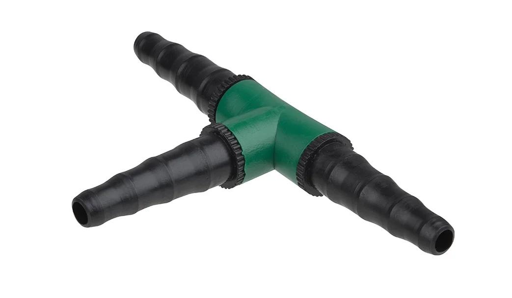 Тройник для соедининия водопроводных шлангов систем полива растений Назначение: для соединения водопроводных шлангов Материал: цветной полипропилен Диаметр шланга от 1/2" до 1" Упаковка: стикер