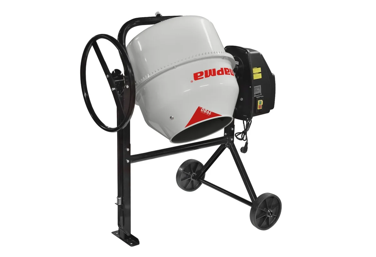 - Ножной механизм фиксации положения барабана, который позволяет удерживать маховик для выгрузки смеси двумя руками.