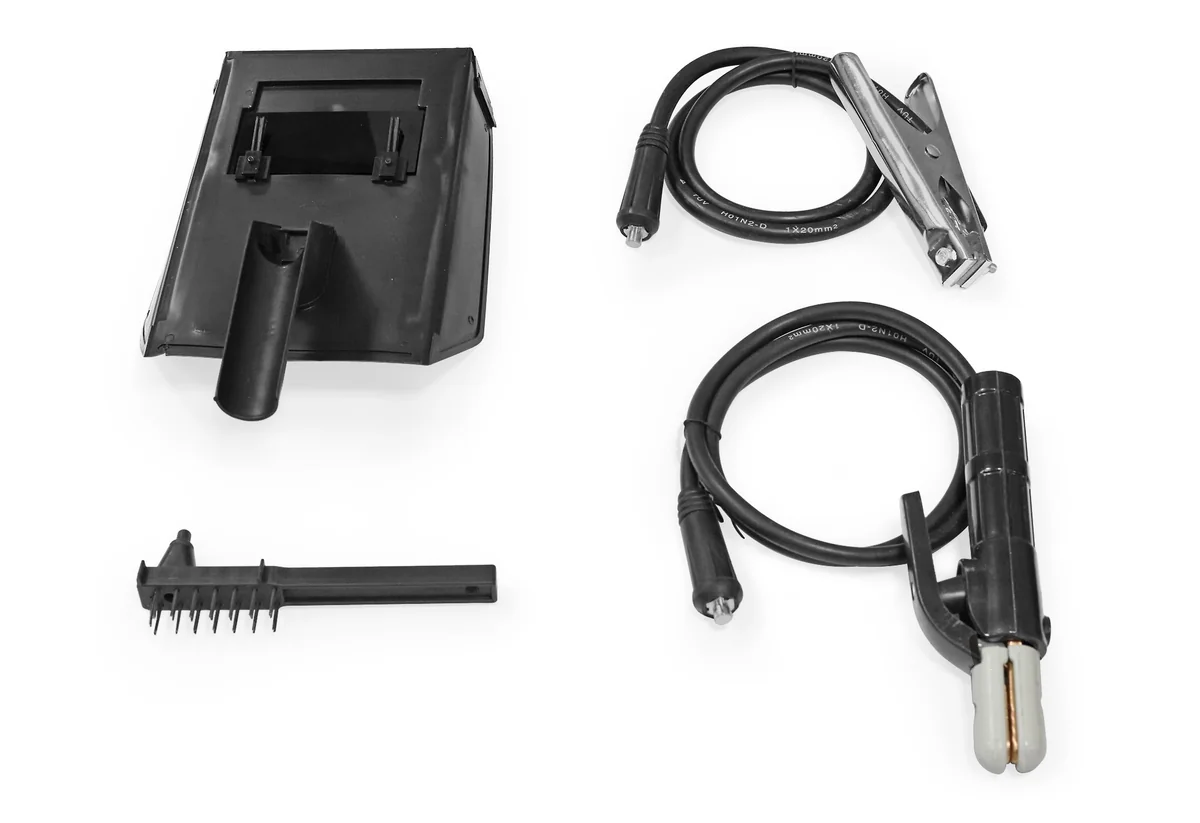 зажим заземления, сварочный кабель с держателем электрода, защитная маска, щетка-молоток, руководство по эксплуатации.