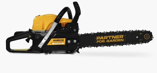 - Блокировка кнопки включения обеспечивает безопасность при работе с бензопилой.