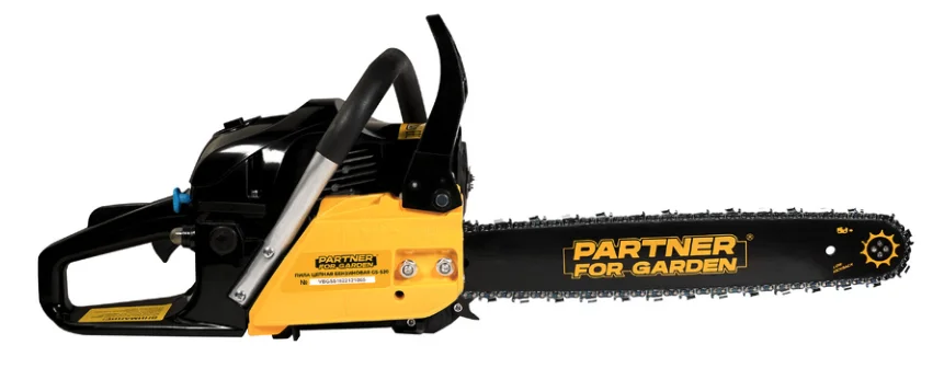 Бензиновая пила Partner For Garden GS 520 полезна во многих бытовых работах. Она оснащена 2-тактным двигателем мощностью 3.5 л. с. и шиной длиной 50 см, которая подходит для распила дерева среднего диаметра. Запуск мотора не займет много времени с Cистемой Easy Start. А работа с пилой не будет отнимать все силы, благодаря сбалансированной конструкции и антивибрационной системе. Производитель позаботился о том, чтобы предотвратить возможные аварийные ситуации. Для защиты рук от летящих опилок предусмотрен щиток на корпусе. Чтобы вы случайно не включили инструмент в неподходящий момент, он оснащен предохранителем клавиши старта. Если пила отскочит в процессе работы, тормоз цепи моментально остановит ее и защитит вас от травм. А если цепь слетит с шины, ее поймает специальный уловитель. Для приготовления топливной смеси можно использовать масло для двухтактных двигателей различных производителей, таких как: STIHL (ШТИЛЬ), РЕСАНТА, FUBAG (ФУБАГ), ЛУКОЙЛ, ГАЗПРОМ, РОСНЕФТЬ и др. Рекомендуем использовать только свежеприготовленную топливную смесь. При хранении инструмента, следует, слить топливо, запустить двигатель и дождаться момента когда двигатель заглохнет. Цепь, которая идет в комплект пилы цепной имеет следующие параметры: шаг цепи 0,325", толщина 1,5 мм и 76 звеньев.