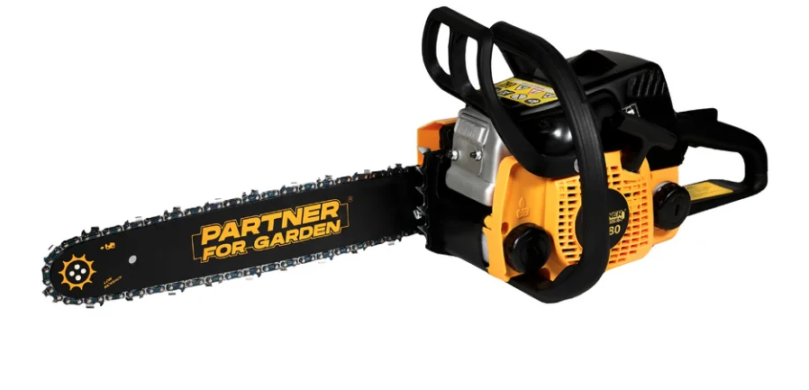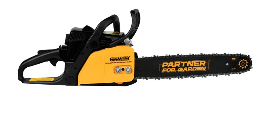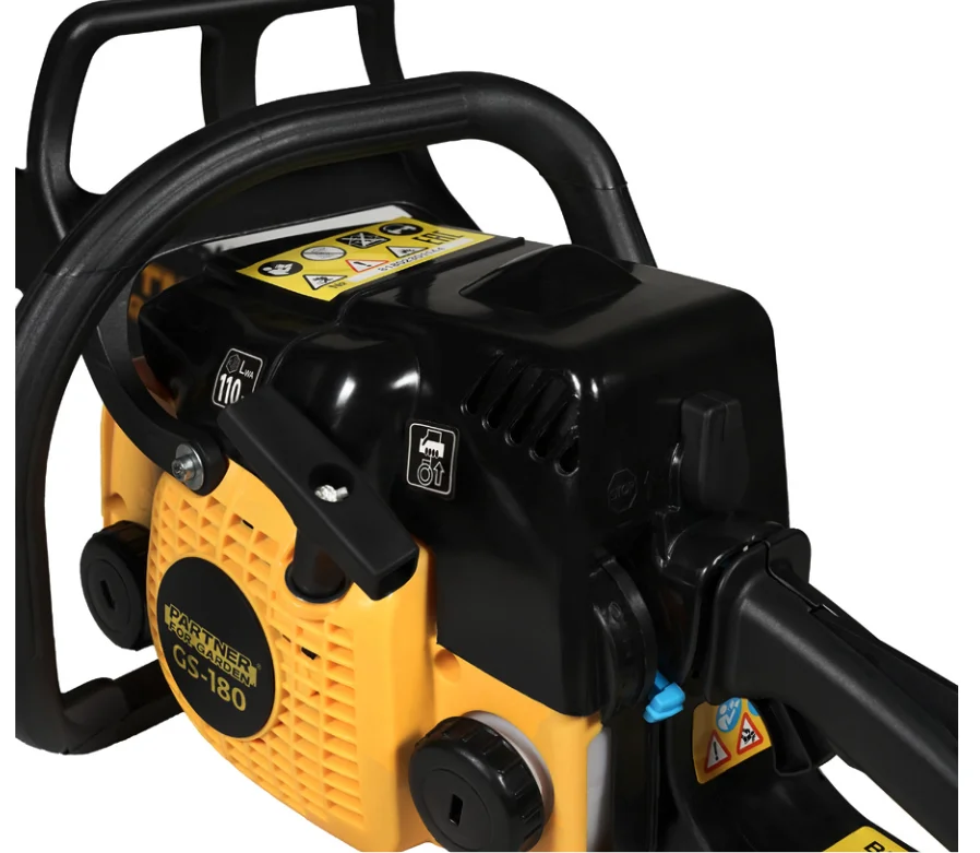 Бензиновая пила Partner For Garden GS 180 полезна во многих бытовых работах. Она оснащена 2-тактным двигателем мощностью 2 л.с. и шиной длиной 40 см, которая подходит для распила дерева среднего диаметра. Запуск мотора не займет много времени с Cистемой Easy Start. А работа с пилой не будет отнимать все силы, благодаря сбалансированной конструкции и антивибрационной системе. Производитель позаботился о том, чтобы предотвратить возможные аварийные ситуации. Для защиты рук от летящих опилок предусмотрен щиток на корпусе. Чтобы вы случайно не включили инструмент в неподходящий момент, он оснащен предохранителем клавиши старта. Если пила отскочит в процессе работы, тормоз цепи моментально остановит ее и защитит вас от травм. А если цепь слетит с шины, ее поймает специальный уловитель. Для приготовления топливной смеси можно использовать масло для двухтактных двигателей различных производителей, таких как: STIHL (ШТИЛЬ), РЕСАНТА, FUBAG (ФУБАГ), ЛУКОЙЛ, ГАЗПРОМ, РОСНЕФТЬ и др. Рекомендуем использовать только свежеприготовленную топливную смесь. При хранении инструмента, следует, слить топливо, запустить двигатель и дождаться момента когда двигатель заглохнет. Цепь, которая идет в комплект пилы цепной имеет следующие параметры: шаг цепи 3,8", толщина 1,3 мм и 55 звена (аналог цепи штиль).
