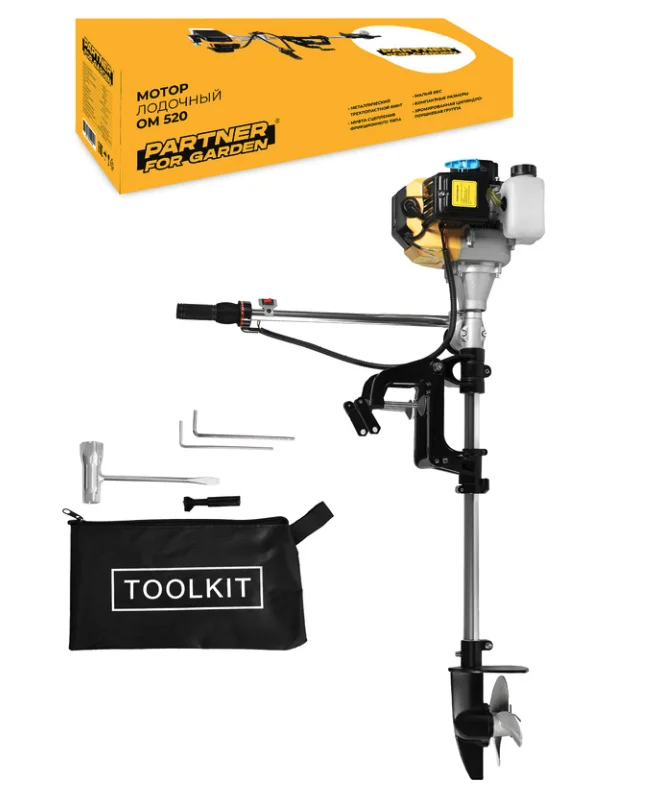 Лодочный мотор Partner for Garden OM 520 это бензиновый, двухтактный агрегат для установки на небольших лодках. Двухтактный бензиновый мотор 3.5 л.с может использоваться для рыбалки, а так же для организации водных перевозок. Устройство легко запускается и управляется, газ регулируется с помощью ручки. Имеет достаточный объем топливного бака для продолжительной работы. Хромированная цилиндро-поршневая группа не подвержена разрушению коррозией, что значительно увеличивает срок службы лодочного мотора. Для приготовления топливной смеси можно использовать масло для двухтактных двигателей различных производителей, таких как: STIHL (ШТИЛЬ), РЕСАНТА, FUBAG (ФУБАГ), ЛУКОЙЛ, ГАЗПРОМ, РОСНЕФТЬ и др.