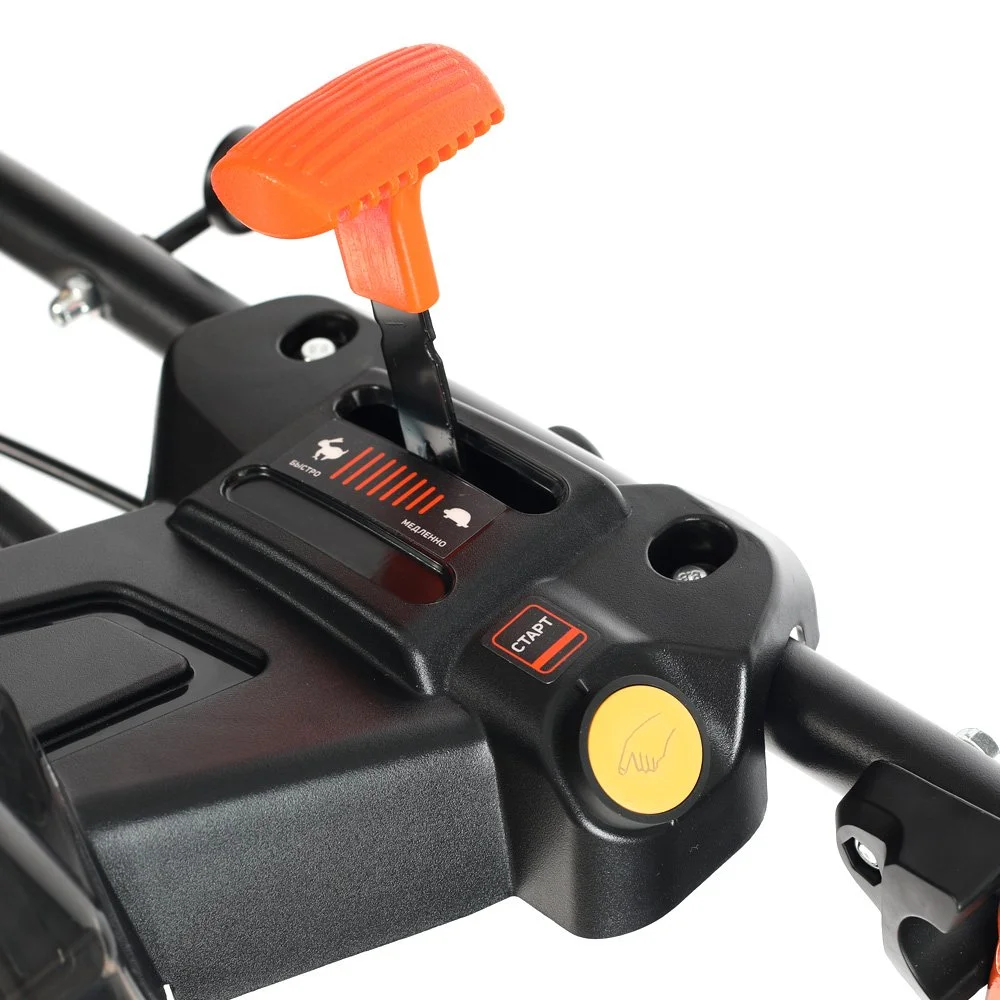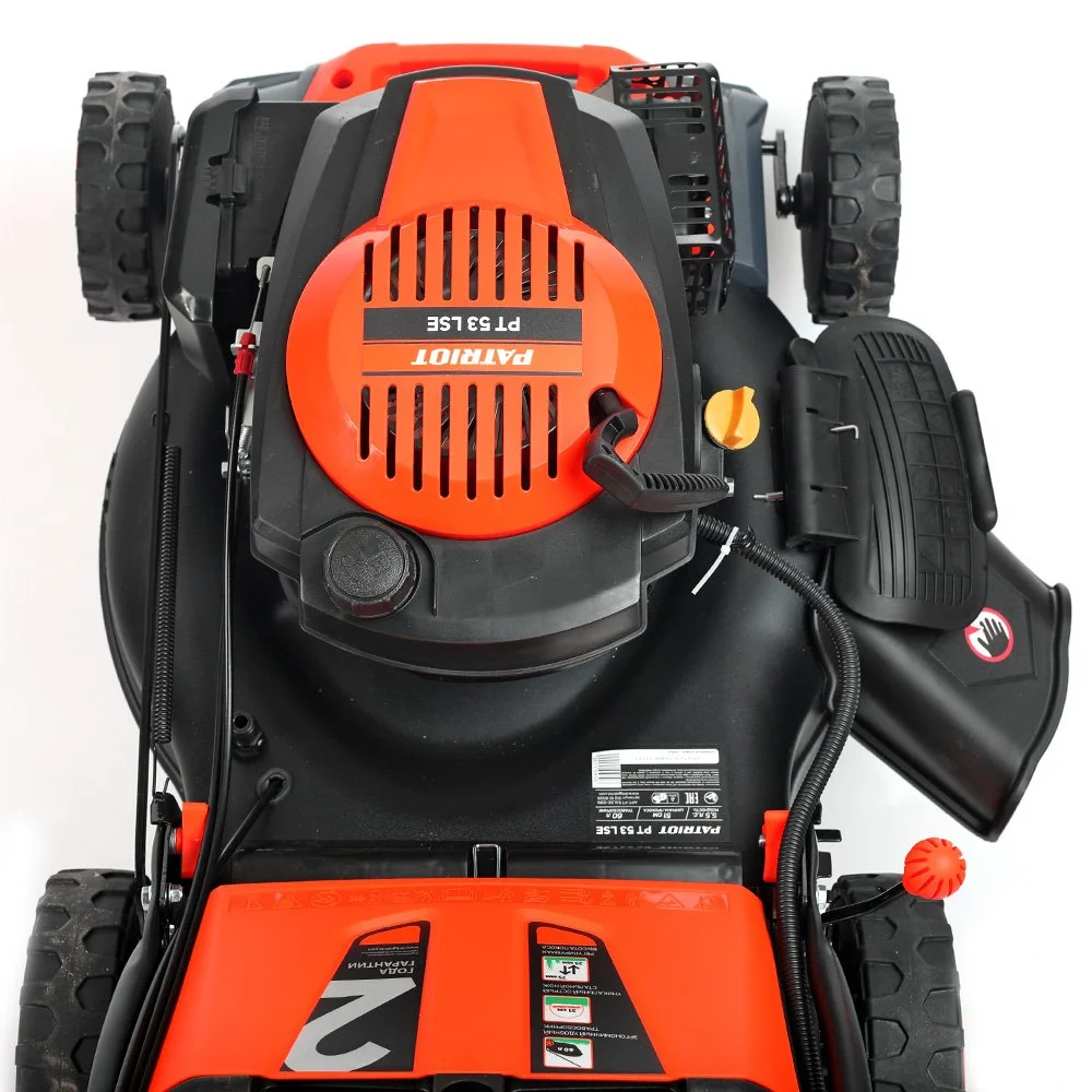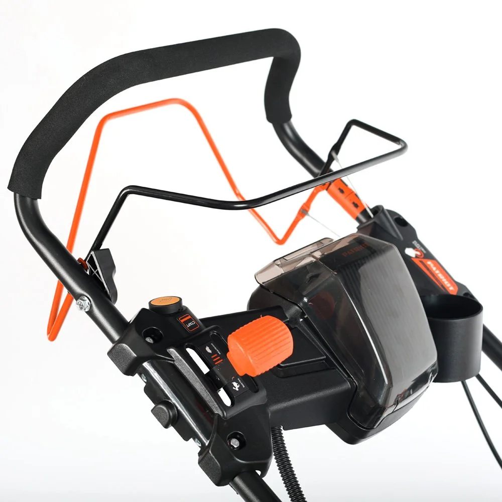 Мощная бензиновая газонокосилка РТ 53 LSE с изменяемой высотой скашивания предназначена для срезания и сбора травы на ровной площади средних и больших участках. Отличительной особенностью газонокосилки является наличие электростарта - возможность запуска от Li-Ion аккумулятора, идущего в комплекте. Возможна работа в трех режимах: сбор травы в травосборник, боковой выброс травы, режим мульчирования. Большие задние колеса придают косилке лучшую устойчивость и стабильность высоты кошения. Газонокосилку отличает легкий запуск, высокая производительность и простота в обслуживании. Складная рукоятка, съёмный травосборник и компактный размер позволяют легко транспортировать и хранить газонокосилку. Для облегчения работы газонокосилка оснащена приводом на колеса. Корпус косилки оснащен штуцером для подключения шланга - для быстрой очистки внутренней части деки после работы. В комплект поставки входит приспособление для мульчирования.