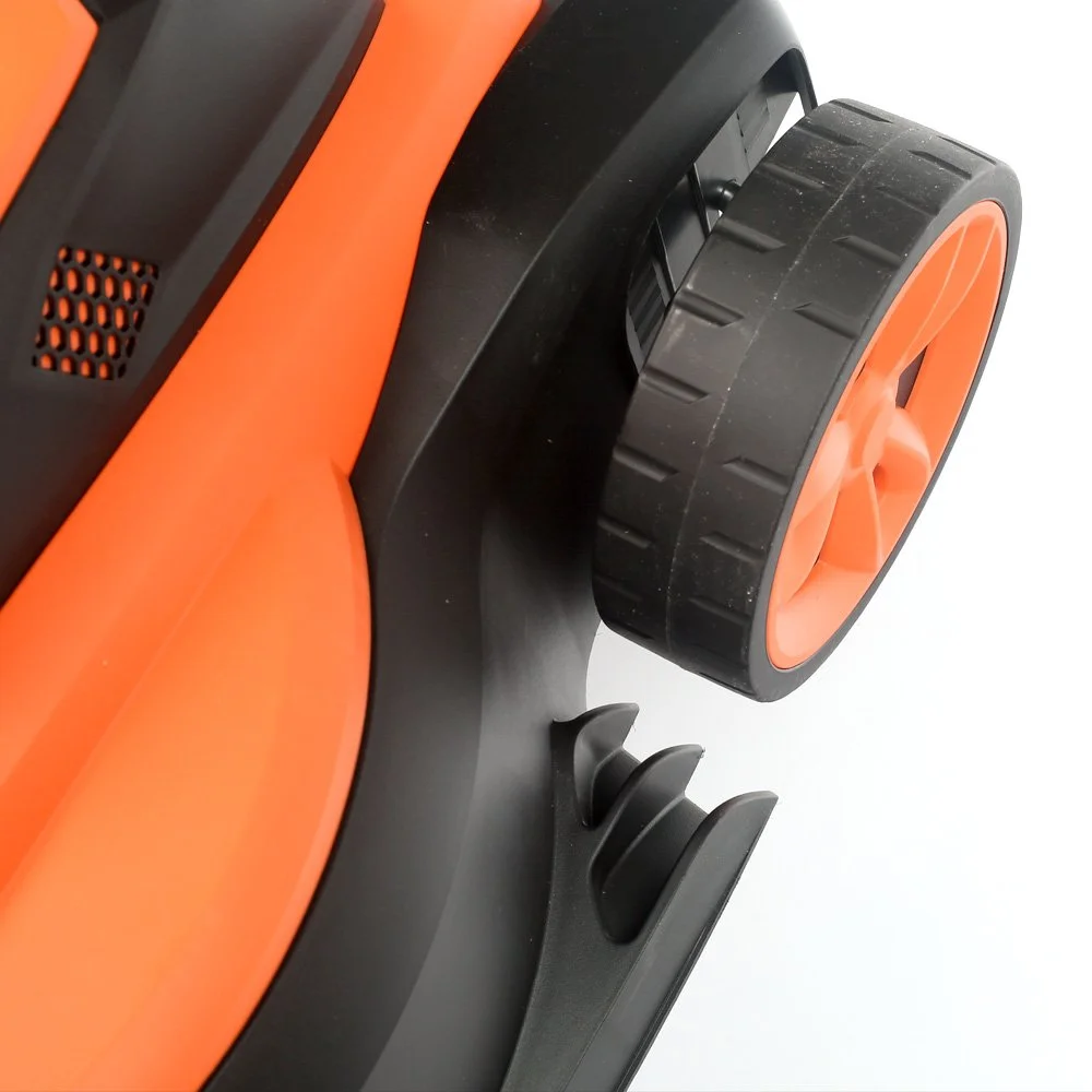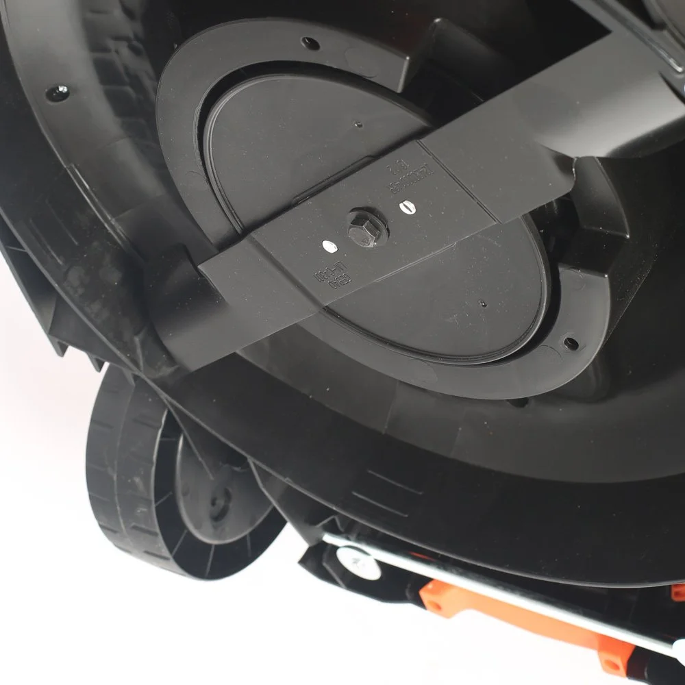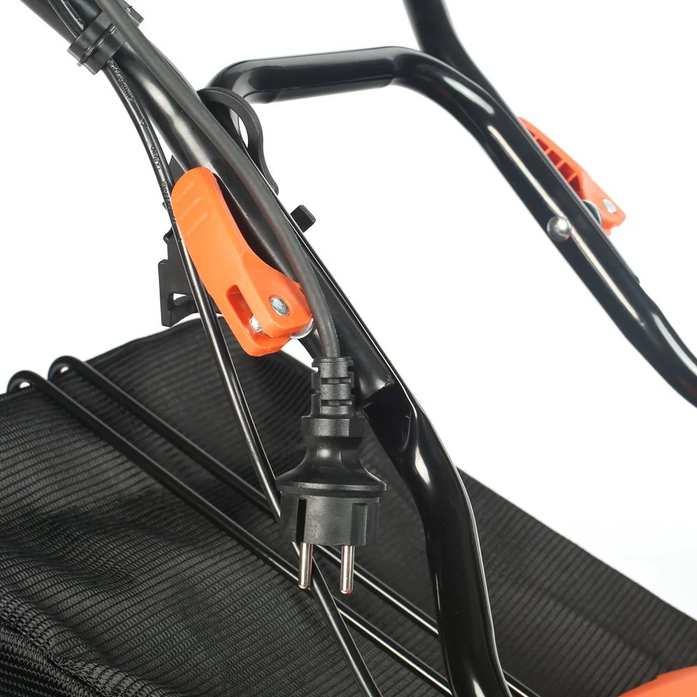 Складная рукоятка, съёмный травосборник и компактный размер позволяют легко транспортировать и хранить газонокосилку.