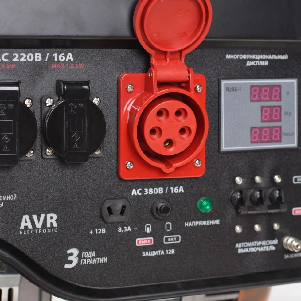 Генератор рассчитан на использование в качестве автономного источника электроэнергии для питания трехфазного оборудования и электроинструмента. Оптимальное соотношение мощности двигателя и электрогенератора обеспечивает стабильную работу на номинальной мощности. Оснащен двигателем с верхним расположением клапанов [OHV], что значительно увеличивает ресурс, снижает выхлоп и уровень шума. Датчик контроля масла исключает запуск и работу генератора при отсутствии или низком уровне масла в картере. Синхронный электрогенератор с системой автоматической регулировки и медными обмотками обеспечивает стабильное выходное напряжение и частоту тока. Цифровой электронный мультидисплей позволяет контролировать все выходные характеристики: напряжение, мощность, ток, частоту, а счетчик моточасов помогает следить за интервалами между техническим обслуживанием. Выход 12 вольт позволяет подзарядить автомобильный аккумулятор в экстренном случае.