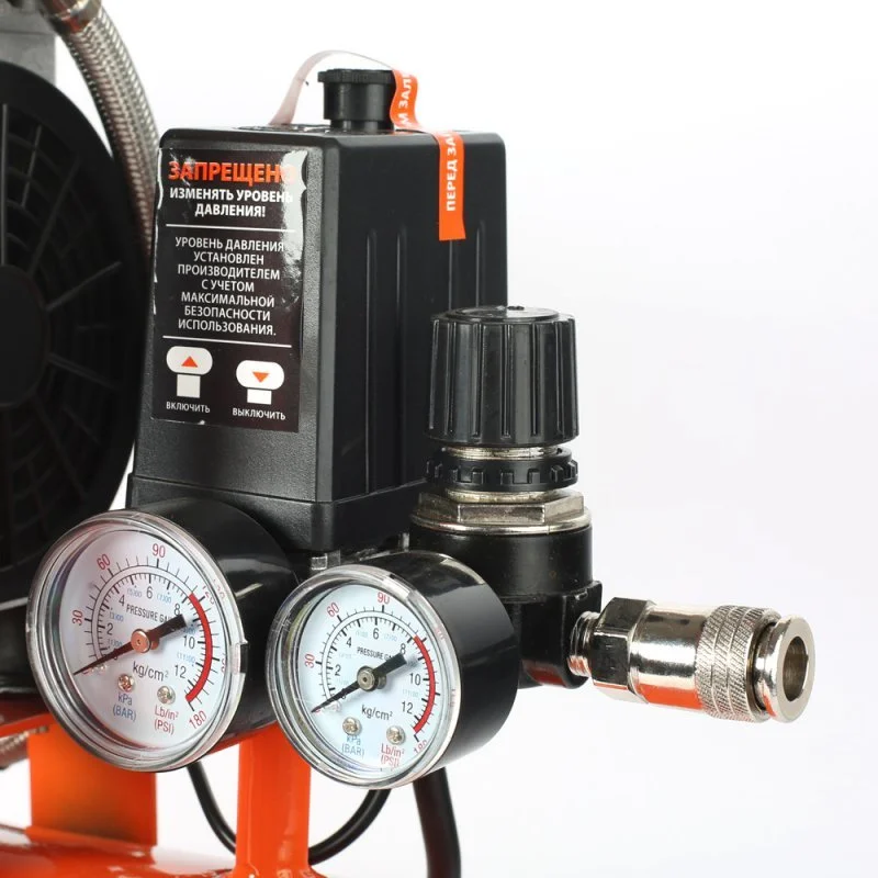- регулировка и контроль давления в ресивере и на выходе при помощи двух манометров;