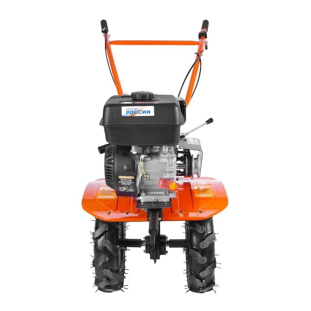 Калуга М – модифицированный мощный бензиновый мотоблок с пониженной передачей и чугунным шестеренчато-цепным редуктором. Мотоблок оснащен четырехтактным двигателем с воздушным охлаждением. В комплектации закаленные фрезы, пневматические колеса с глубоким профилем протектора, сошник. Укрепленная рама с универсальной сцепкой позволяет установить дополнительное навесное оборудование или использовать вместе с тележкой. Первая пониженная передача улучшает проходимость мотоблока и позволяет без труда вспахивать тяжелые почвы. Кнопка включения, рукоятка газа и рычаг привода расположены на руле. Наклон руля регулируется.
