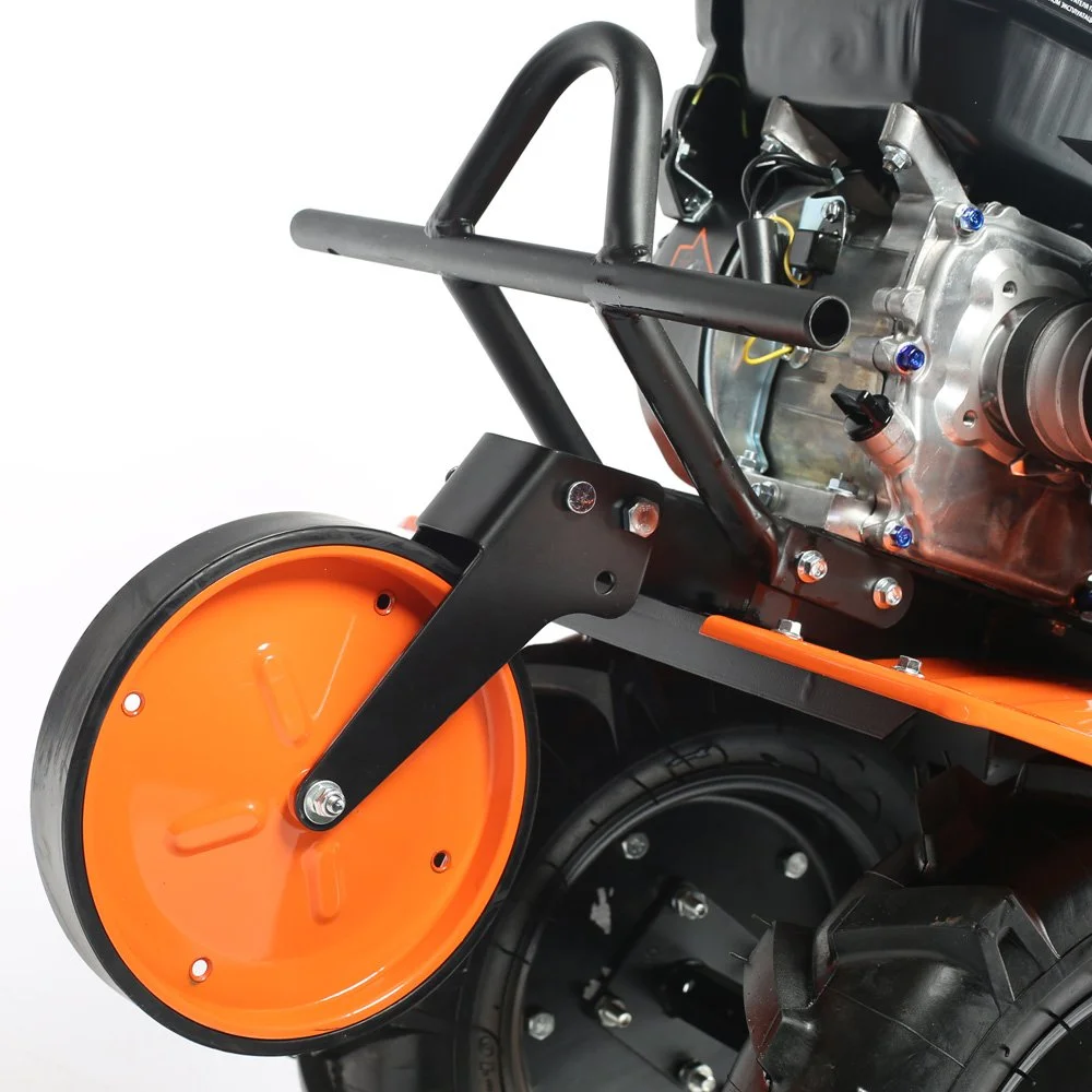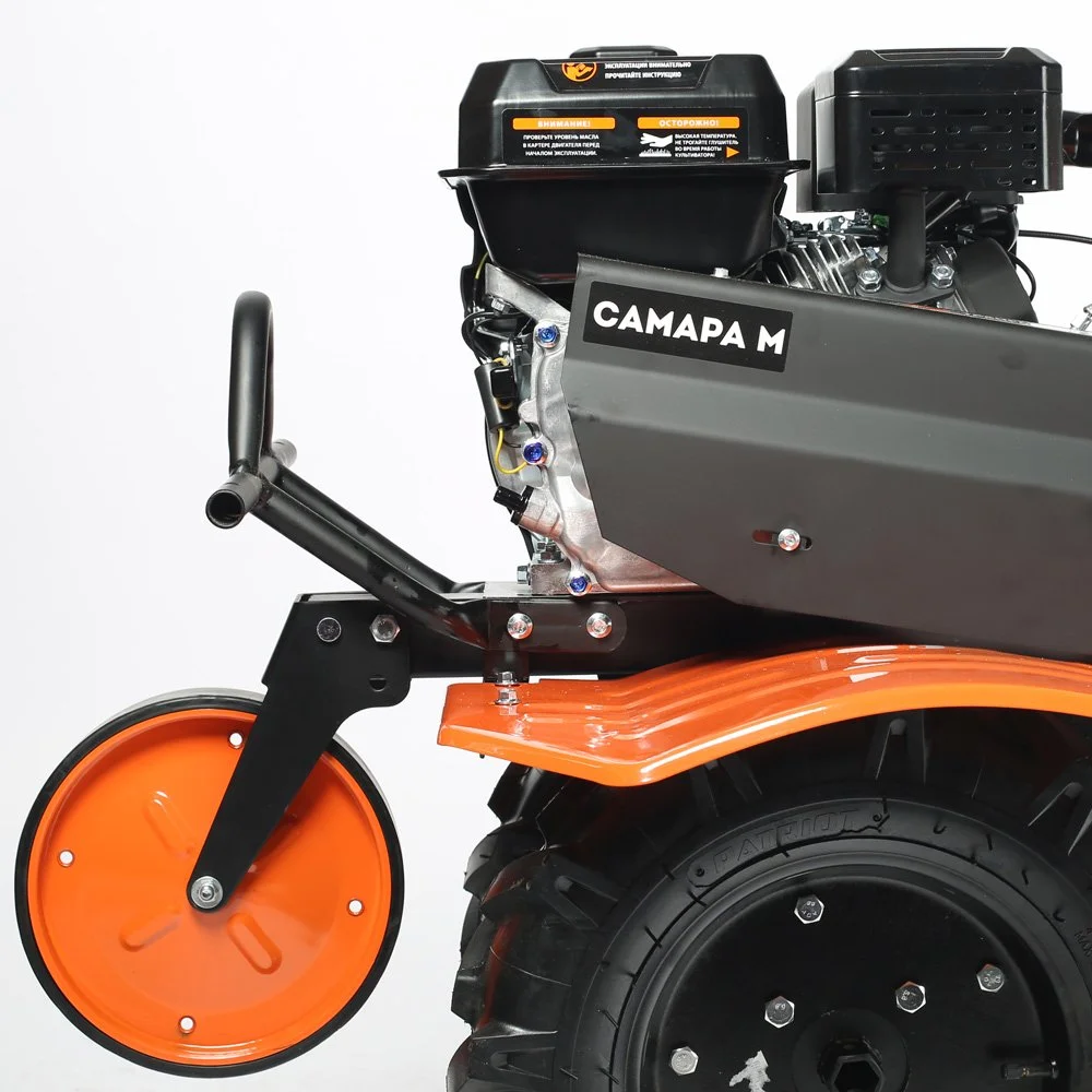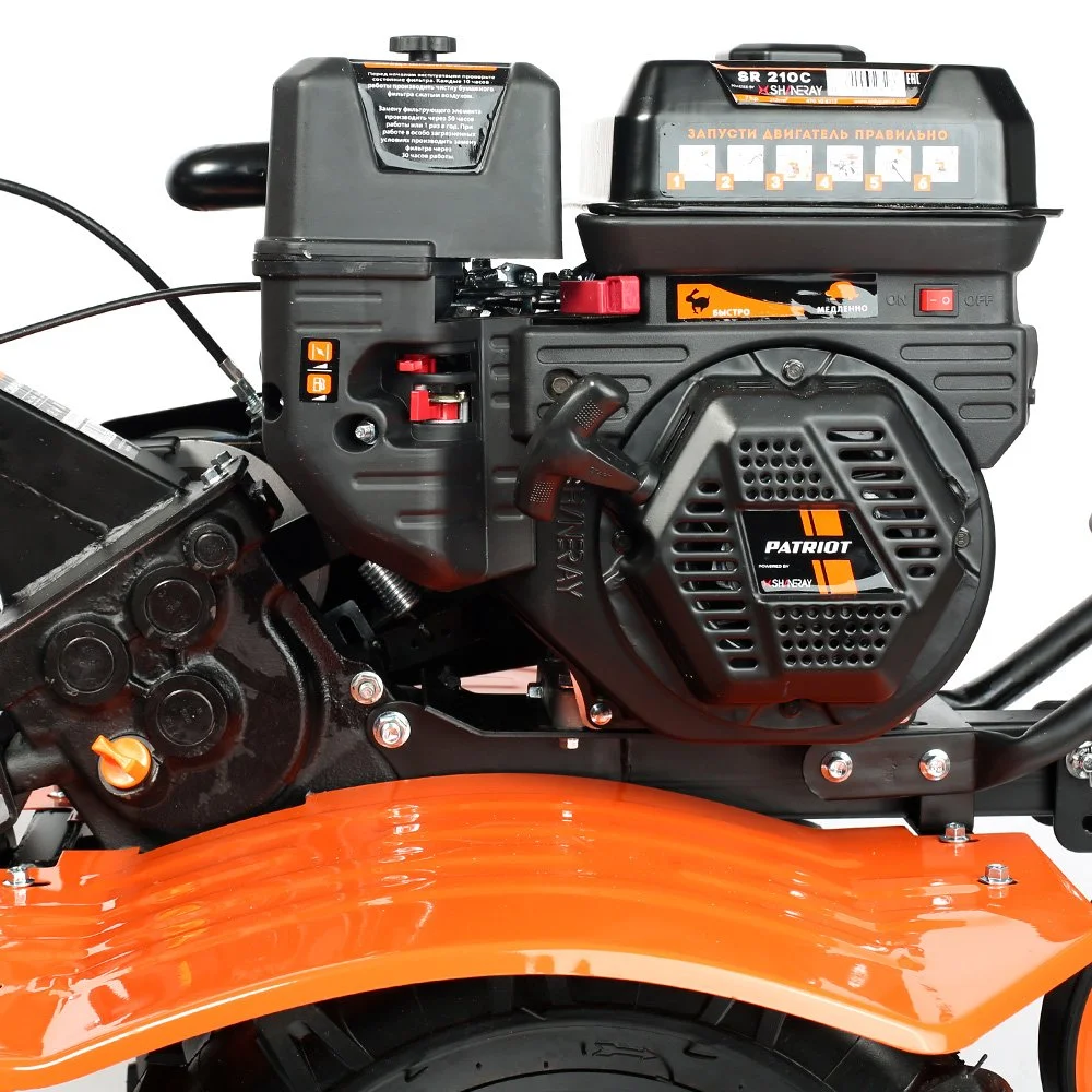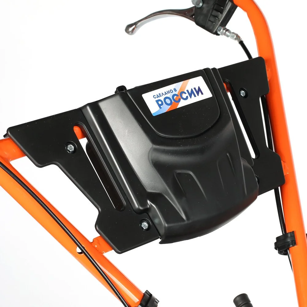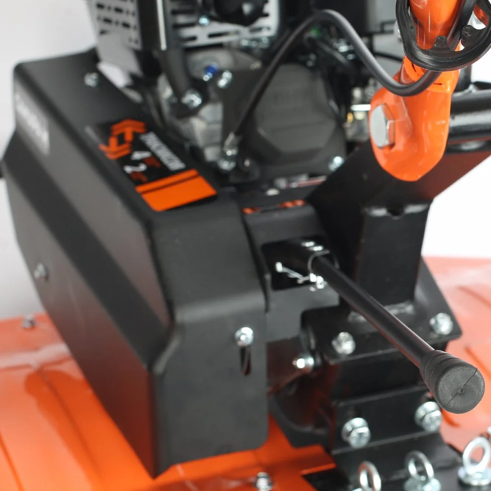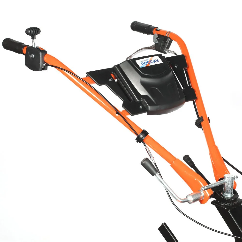 Это мощный, многофункциональный мотоблок с двигателем 7 л.с повышенного ресурса и чугунным редуктором. Укомплектован фрезами и пневматическими колесами. Установлена ручка с возможностью регулировки и поворота в разных плоскостях. Переключение скоростей осуществляется через коробку передач, а включение пониженной или повышенной передачи можно производить перекидыванием ремня с одной проточки шкива на другую: 4 вперед, 2 назад. Уже установленный на мотокультиватор трехручейковый шкив дает возможность подключать косилку и снегоуборщик, а мощный прицепной узел является самым распространенным в России и дает возможность устанавливать различное навесное оборудование, включая тележку. Отдельно можете приобрести и установить роторную косилку, шнекороторный снегоотбрасыватель, тележку, плуг, окучник, картофелевыкапыватель, а если установить гусеничную приставку, то получится мотобуксировщик для движения по глубокому снегу и бездорожью.