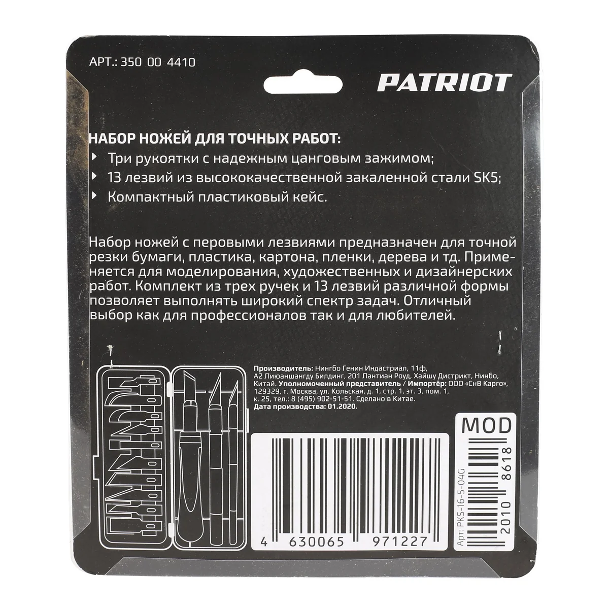 - набор ножей PATRIOT PKS-16 с перовыми лезвиями предназначен для точной резки бумаги, пластика, картона, плёнки, дерева. Применяется при моделировании, художественных и дизайнерских работах.